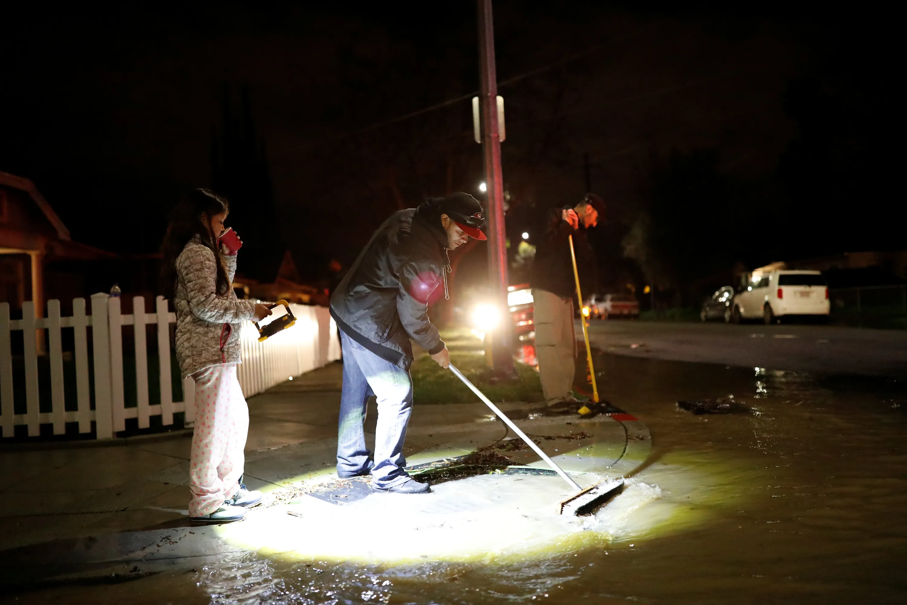 A man attempts to unclog a storm drain on South 20th Street as water continues to rise after heavy rains overflowed nearby Coyote Creek in San Jose, California, U.S. February 21, 2017. (Photo by Stephen Lam/Reuters)