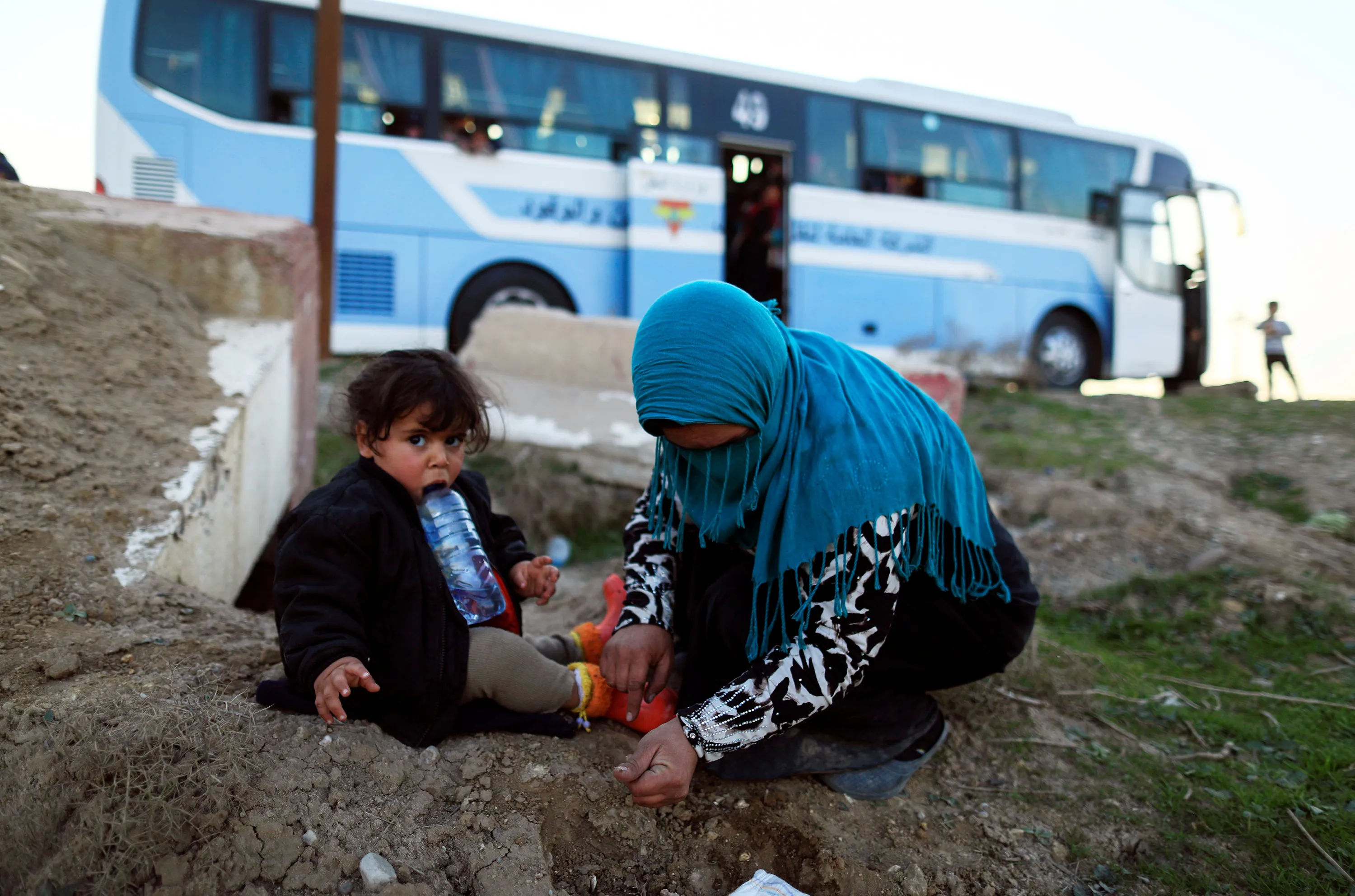 A woman, who just fled a village controled by Islamic State militants, checks her daughter as she sits in front of a bus before heading to the camp at Hammam Ali, south of Mosul, Iraq February 22, 2017. (Photo by Zohra Bensemra/Reuters)