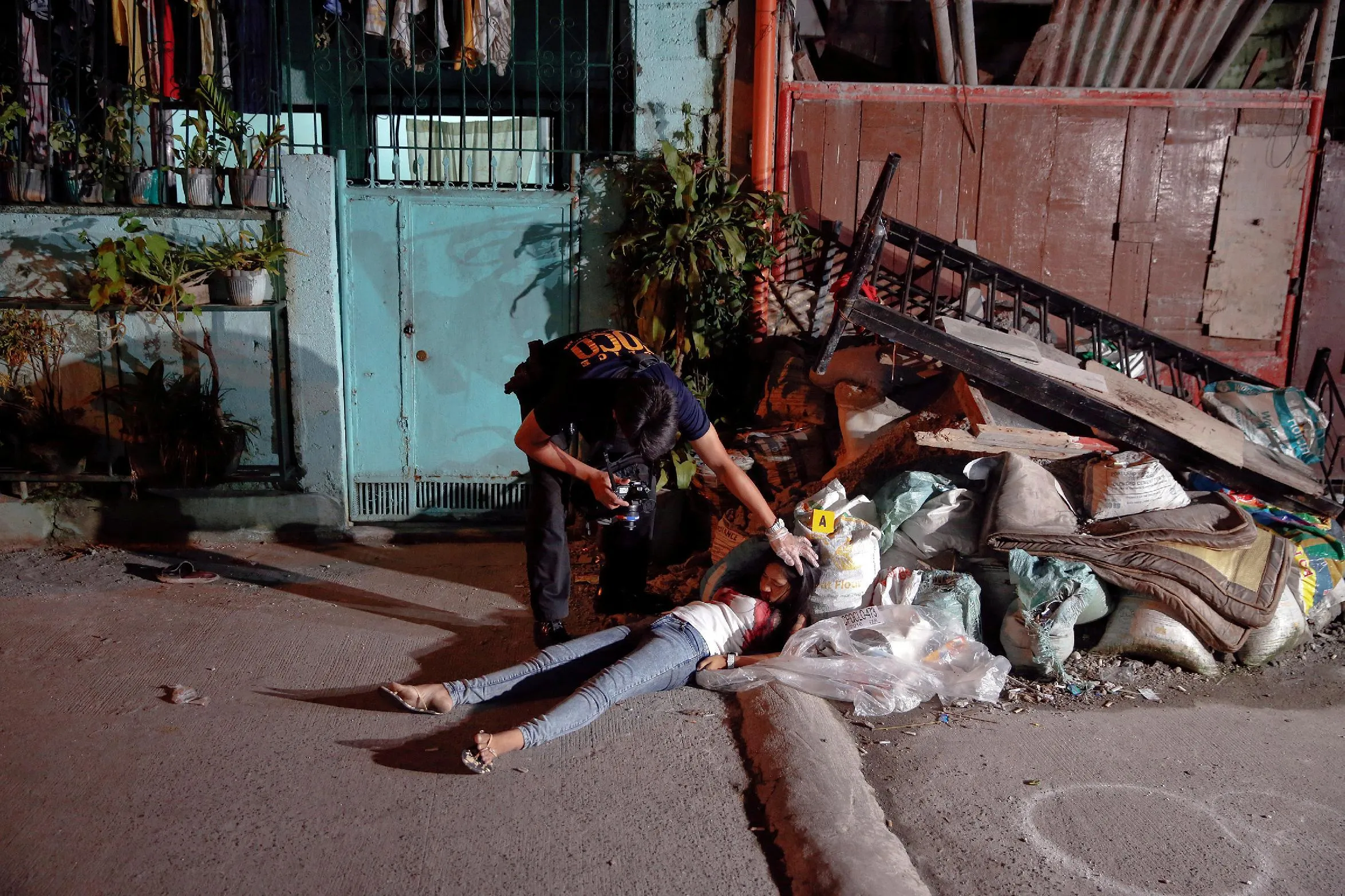 A policeman investigates at the site where a 17 year old girl and a 21 year old man were killed by unknown motorcycle-riding gunmen in an alley in Manila, Philippines early October 26, 2016. According to the police, a sign on a cardboard reading “Tulak ka, hayop ka”, which translates to “You are a (drug) pusher, you are an animal” was found with the the body of the killed man. (Photo by Damir Sagolj/Reuters)
