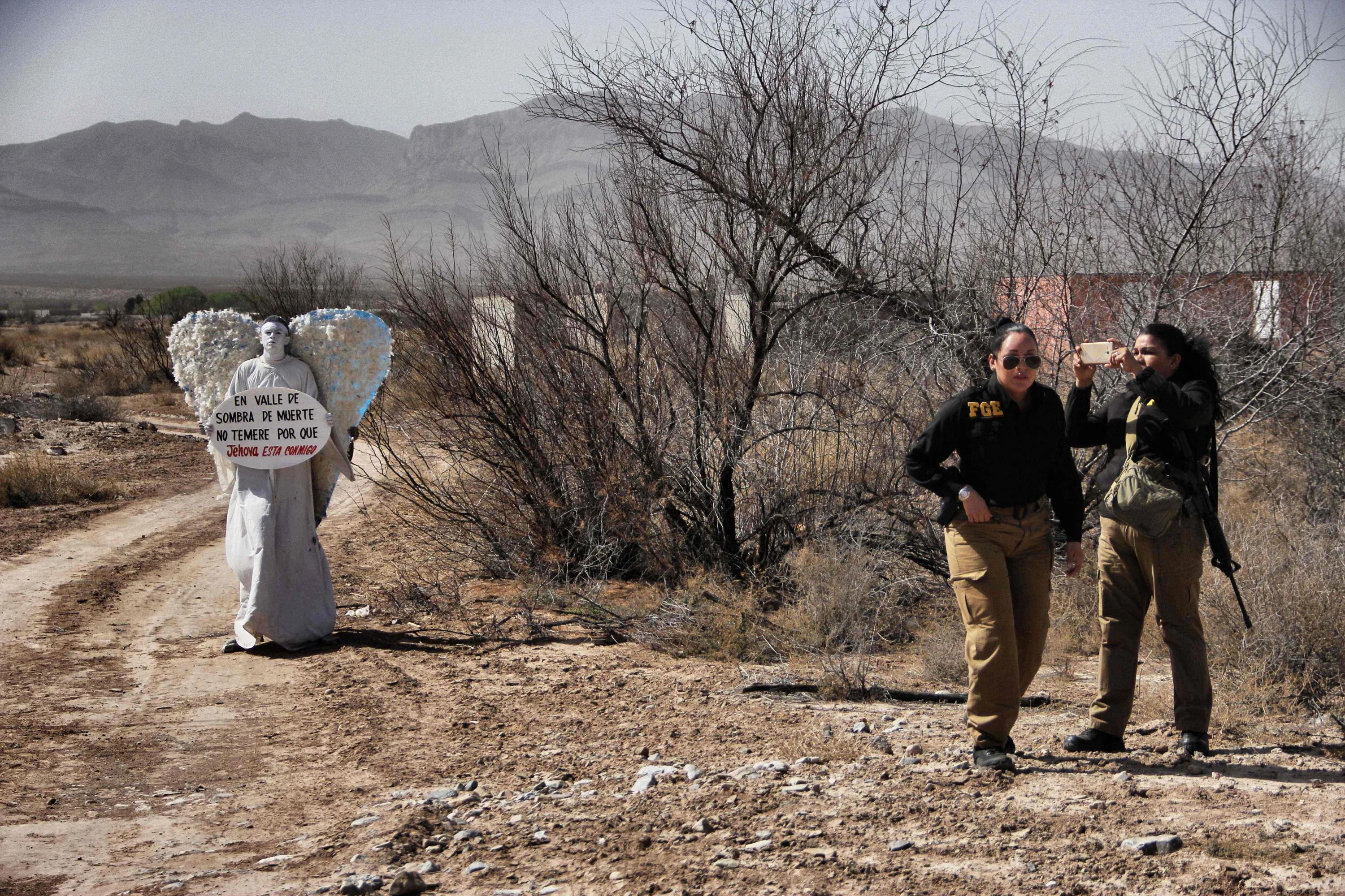 A young woman (L) who is a member of the “Psalm 100” evangelical church, dressed as a messenger of peace angel, calls for justice for women whose bodies were dumped in the Navajo Arroyo, 60 km south of Ciudad Juarez, in the Juarez Valley desert in Chihuahua state, northern Mexico, on February 23, 2017. (Photo by Herika Martinez/AFP Photo)