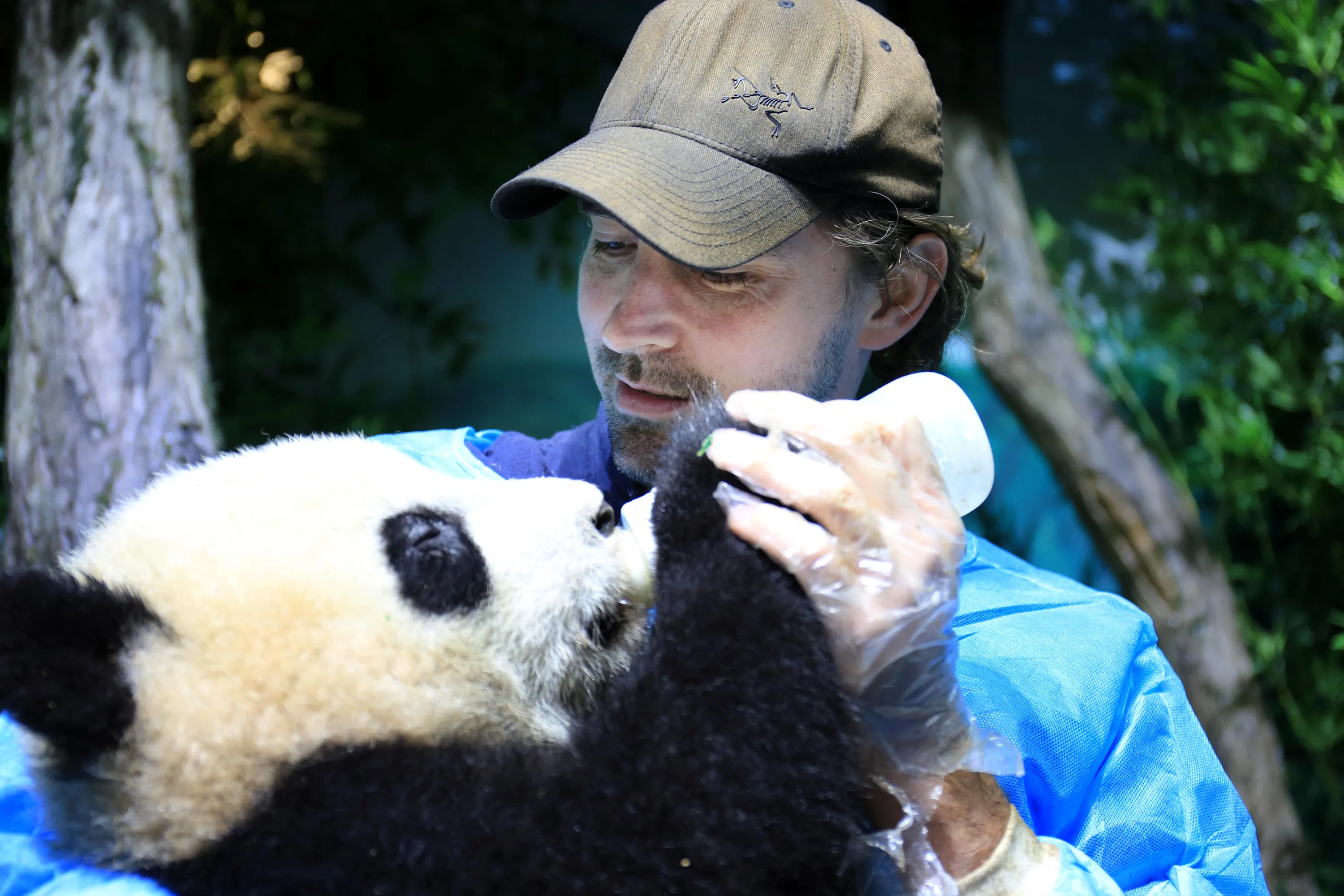 Actor Lee Pace feeds a giant panda baby at Chengdu Research Base of Giant Panda Breeding as he visits the base and is awarded as the “Chengdu Pambassador” in Chengdu, Sichuan province, China, February 21, 2017. (Photo by Reuters/China Daily)