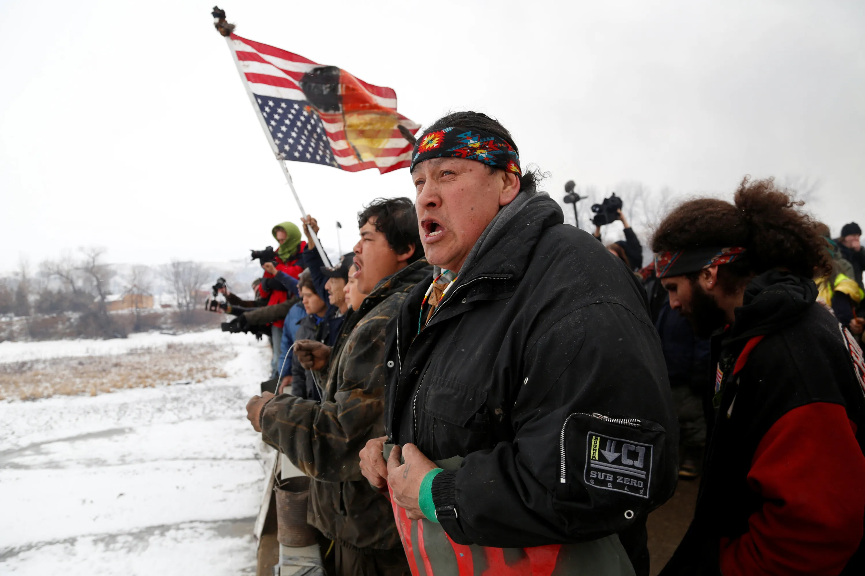 Raymond Kingfisher, 59, of the Northern Cheyenne Tribe, sings during a march on the outskirts of the main opposition camp against the Dakota Access oil pipeline near Cannon Ball, North Dakota, U.S., February 22, 2017. (Photo by Terray Sylvester/Reuters)