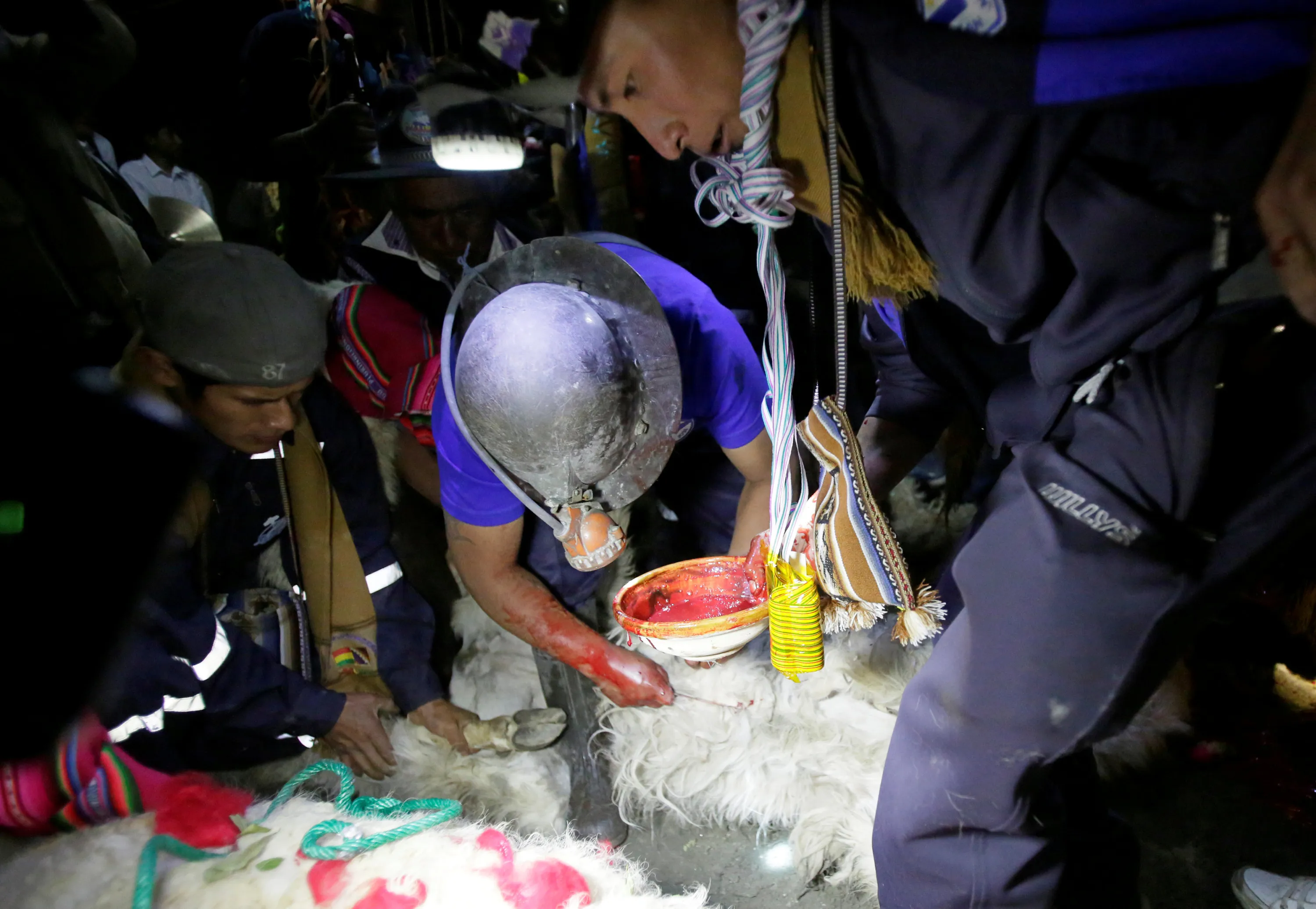 A independent miner tries to get a heart of a Llama during a ritual for good fortune in the year as part of Andean carnival celebrations at the Mina Itos on the outskirts of Oruro, Bolivia February 24, 2017. (Photo by David Mercado/Reuters)
