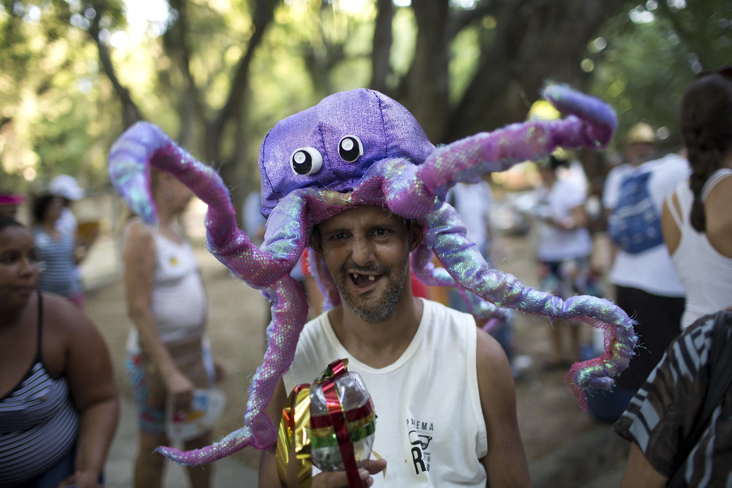 A patient from the Nise da Silveira Mental Health Institute wears an octopus costume during the institute's carnival parade, coined in Portuguese: “Loucura Suburbana”, or Suburban Madness, in the streets of Rio de Janeiro, Brazil, Thursday, February 23, 2017. (Photo by Silvia Izquierdo/AP Photo)