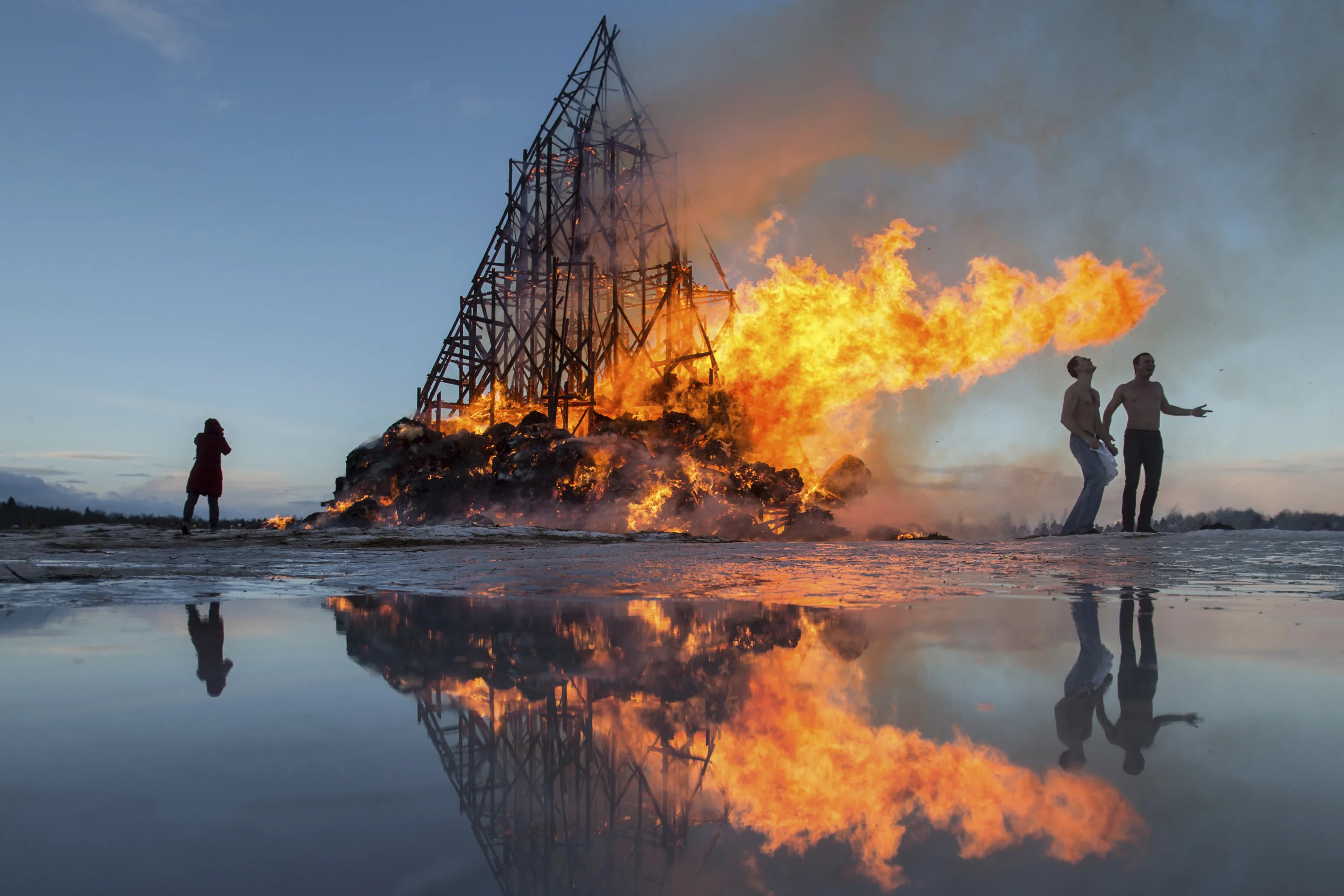 In this photo taken on Saturday, February 25, 2017, people react as a sculpture is burning at the Maslenitsa festival at the Nikola-Lenivets art park in Nikola-Lenivets village, about 200 kilometers (125 miles) south-west of Moscow, Russia. As part of the celebrations of the “Butter Week”, or Maslenitsa in Russian, a folk holiday which heralds the beginning of spring, contemporary artist and park founder Nikolay Polissky built a giant sculpture made of wood and hay which was burnt to ashes in a traditional bonfire. (Photo by Denis Tyrin/AP Photo)