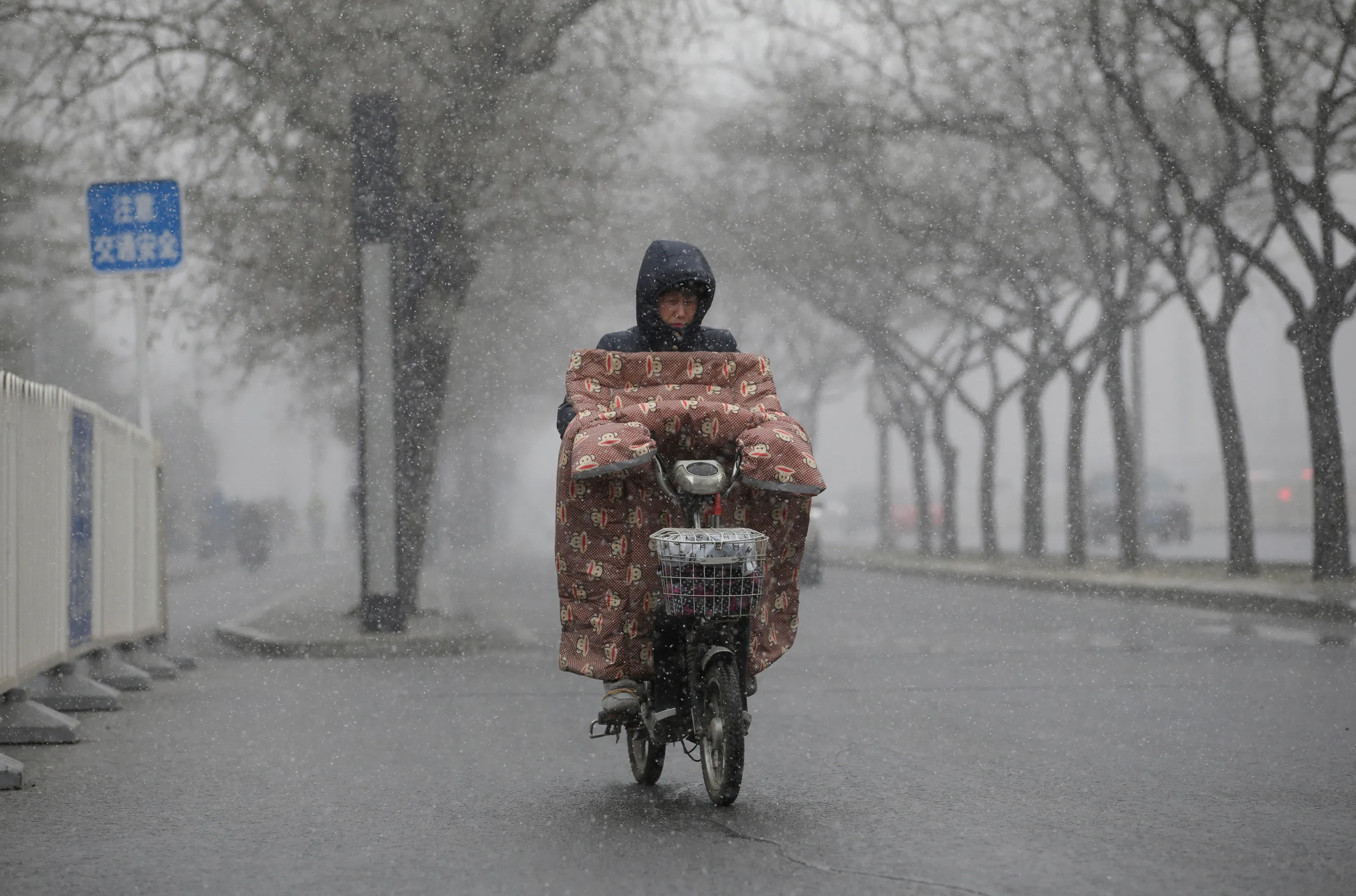 A woman rides an electric bicycle during a snowfall in Beijing, China February 21, 2017. (Photo by Jason Lee/Reuters)