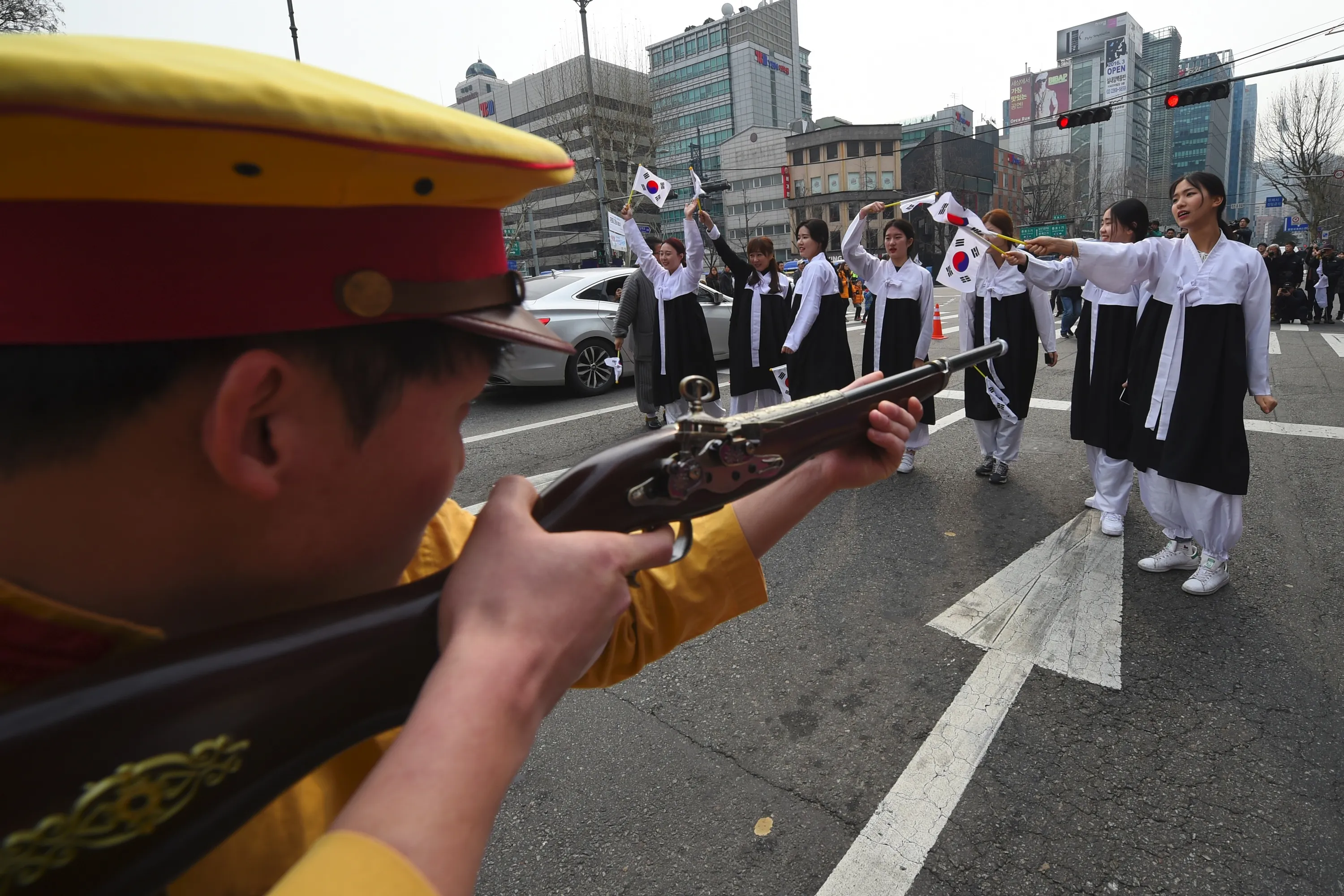 South Korean activists dressed as colonial-era Japanese soldiers reenact a crackdown of the independence movement during celebrations of the 98th Independence Movement Day in Seoul on March 1, 2017. South Korea on March 1 marked the anniversary of the country's 1919 uprising against the 1910-1945 Japanese colonial rule. (Photo by Jung Yeon-Je/AFP Photo)