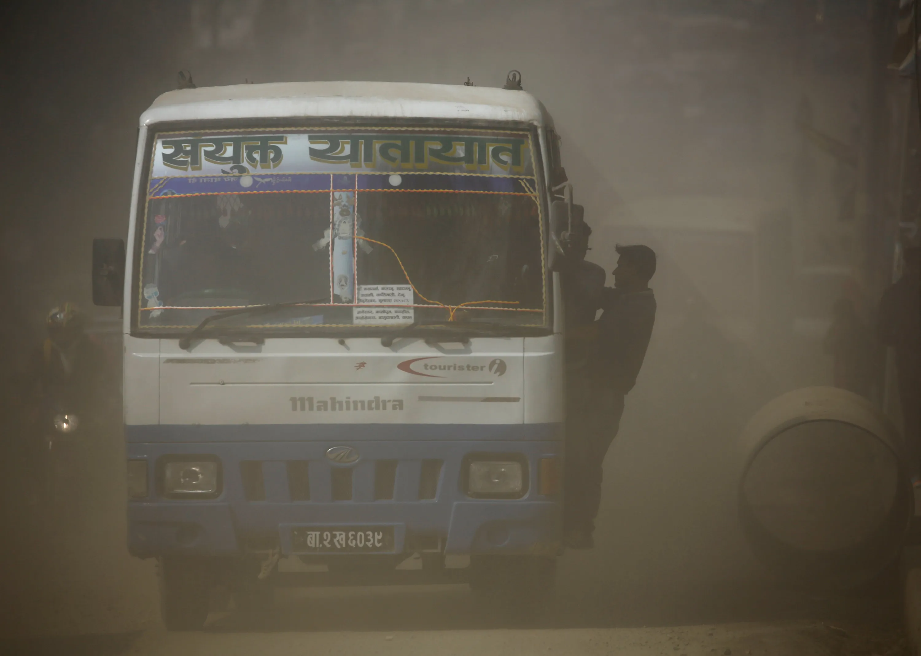 A passenger bus travels along a dusty road in Kathmandu, Nepal February 27, 2017. (Photo by Navesh Chitrakar/Reuters)