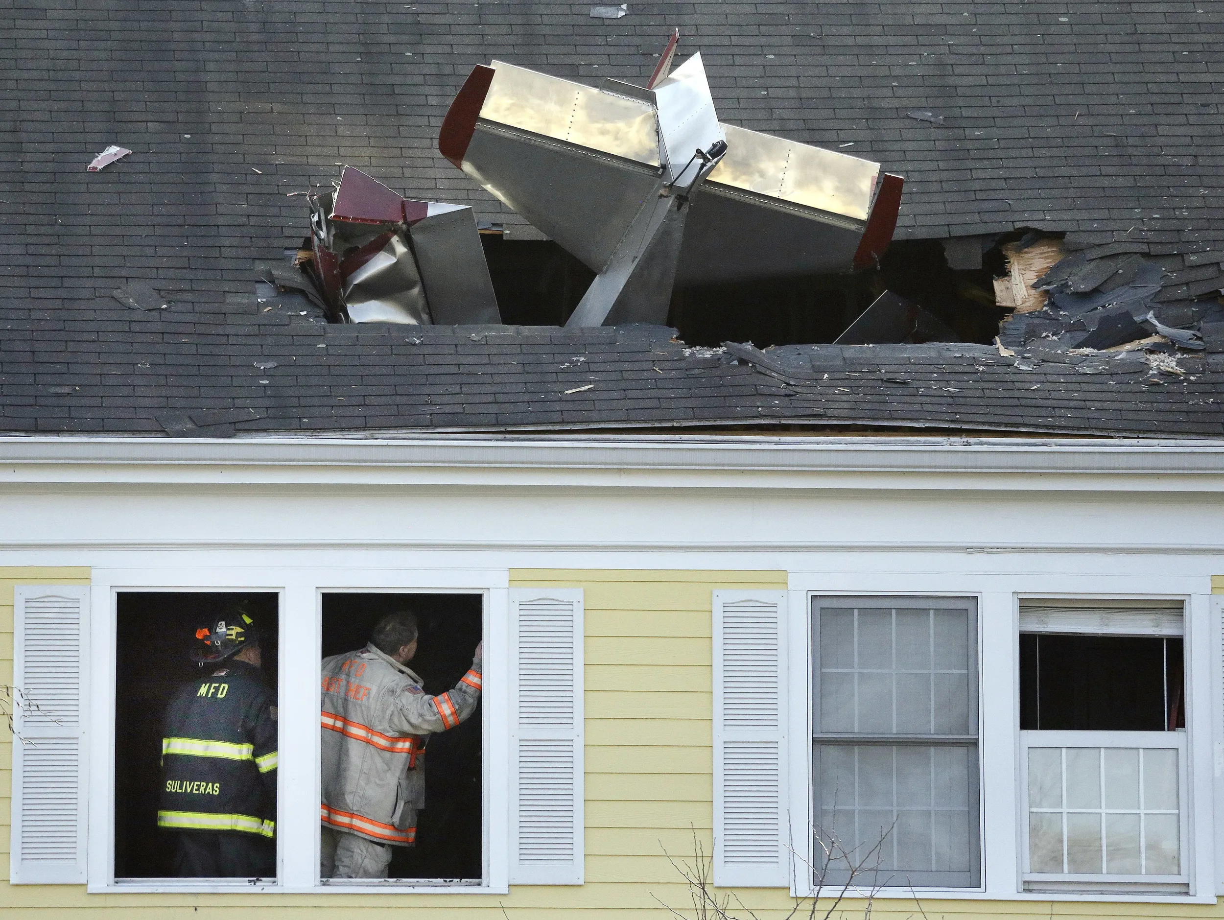 Firefighters investigate the scene after a single-engine aircraft crashed into a building across the Merrimack River from Lawrence Municipal Airport, Tuesday, February 28, 2017, in Methuen, Mass. According to police, the pilot of the home-built plane was killed, while no one in the building was hurt. (Photo by Elise Amendola/AP Photo)