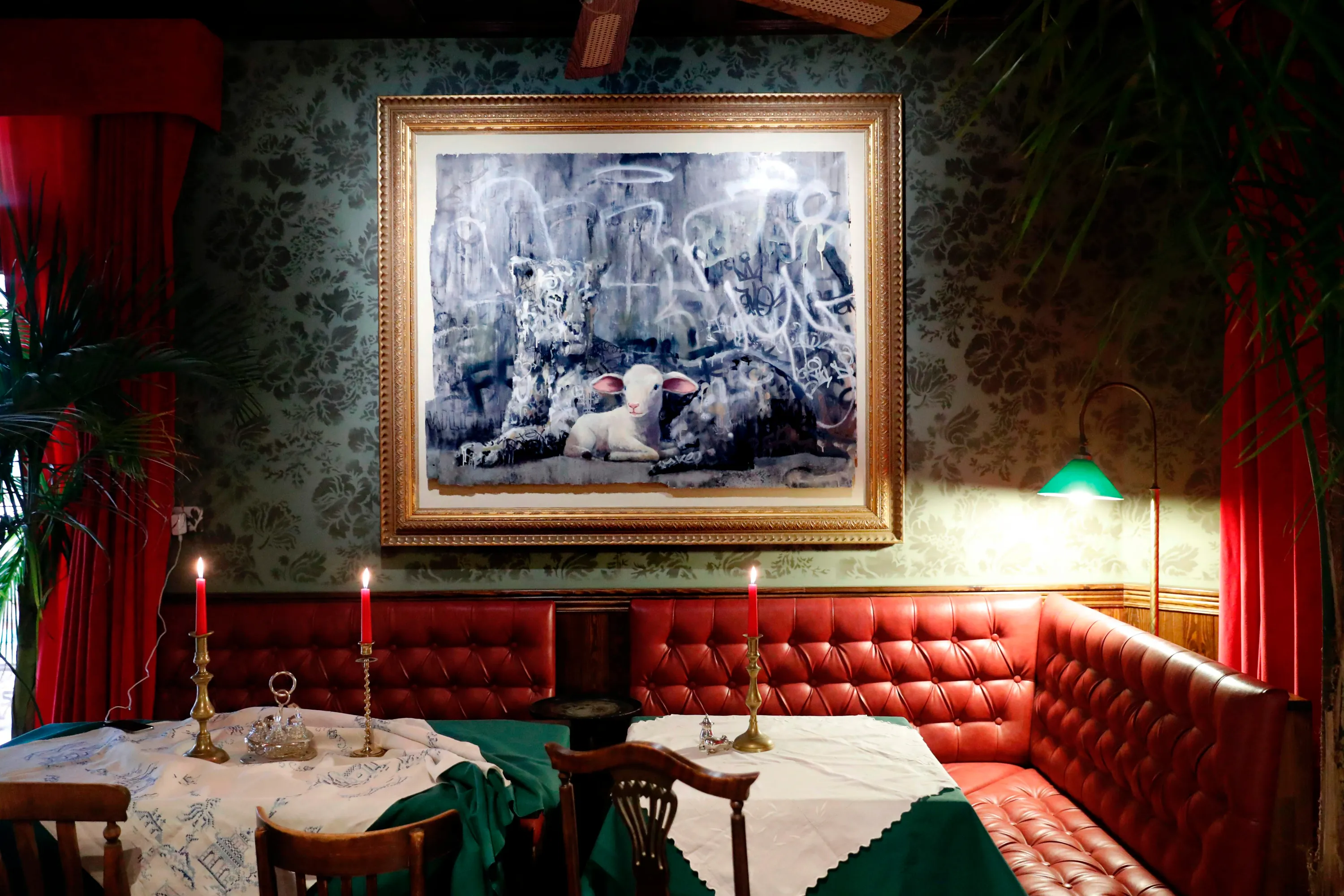 A Banksy installation hangs above the booths in the lobby at street artist Banksy' s newly opened Walled Off hotel in the Israeli occupied West Bank town of Bethlehem, on March 3, 2017. (Photo by Thomas Coex/AFP Photo)