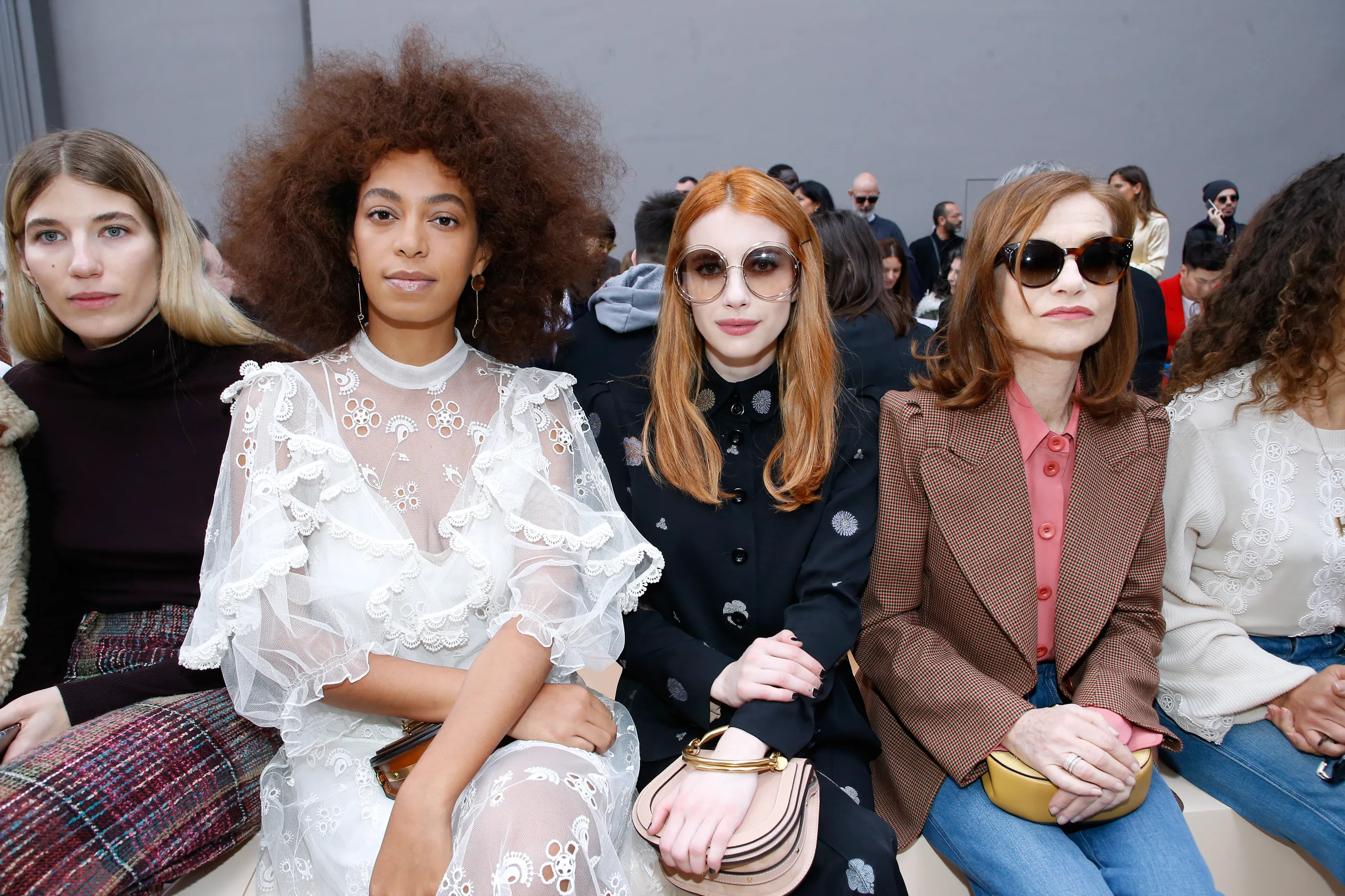(L-R) Solange Knowles, Emma Roberts, Isabelle Huppert and Houda Benyamina attend the Chloe show as part of the Paris Fashion Week Womenswear Fall/Winter 2017/2018 on March 2, 2017 in Paris, France. (Photo by Bertrand Rindoff Petroff/Getty Images)