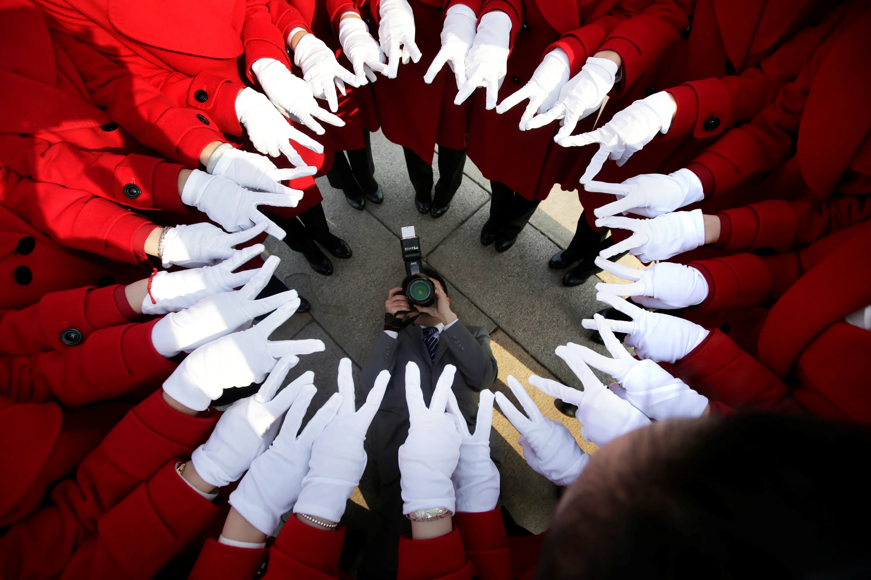 Attendants serving delegates from a hotel pose for a photo at Tiananmen Square as delegates attend a meeting during the annual session of China's parliament, the National People's Congress (NPC), in Beijing, China March 4, 2017. (Photo by Jason Lee/Reuters)