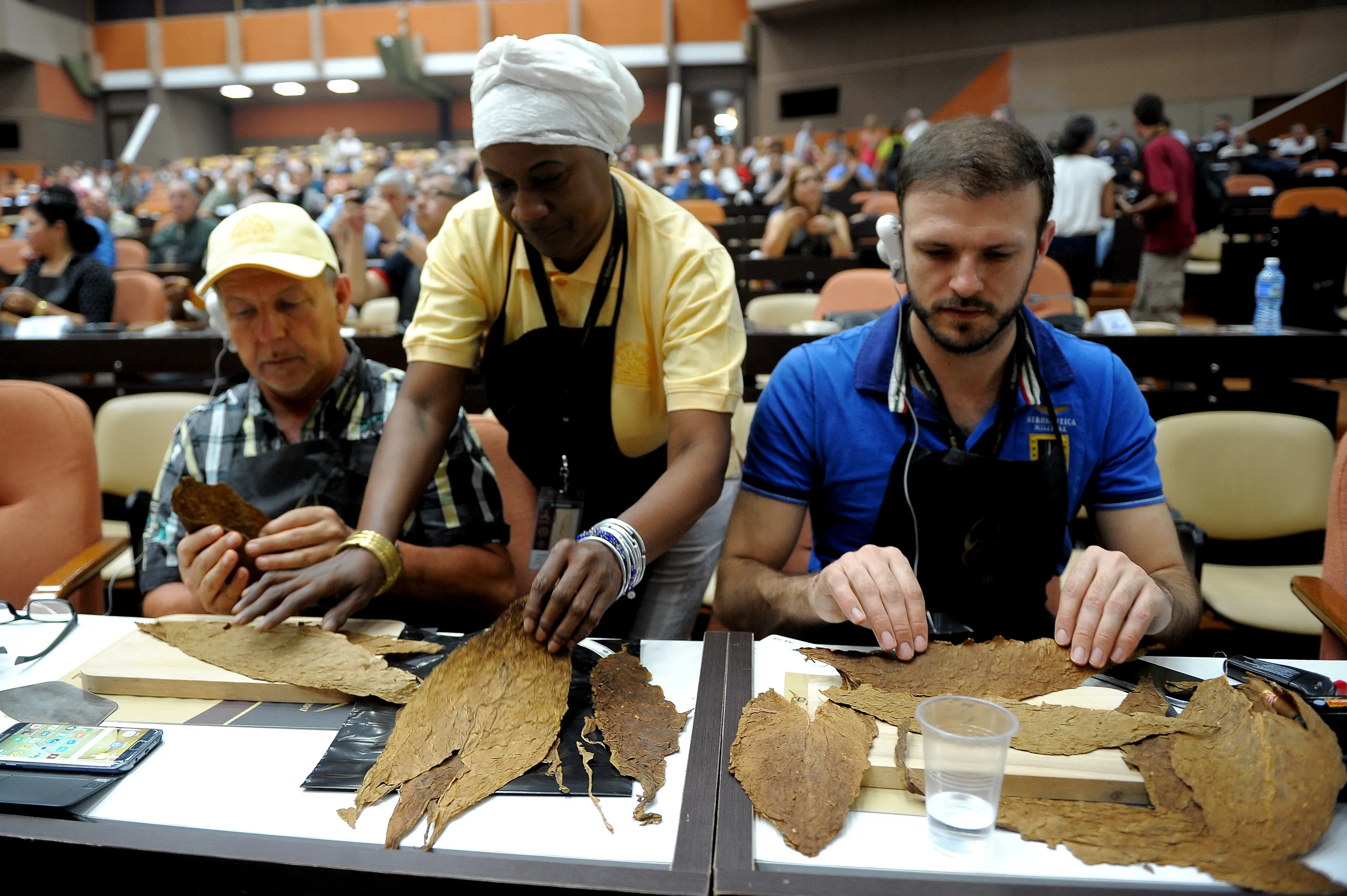 A cigar roller (C) teaches participants in a handmade cigar rolling master class at the Convention Palace during the XIX Havana Cigar Festival, in Havana, on March 1, 2017. (Photo by Yamil Lage/AFP Photo)