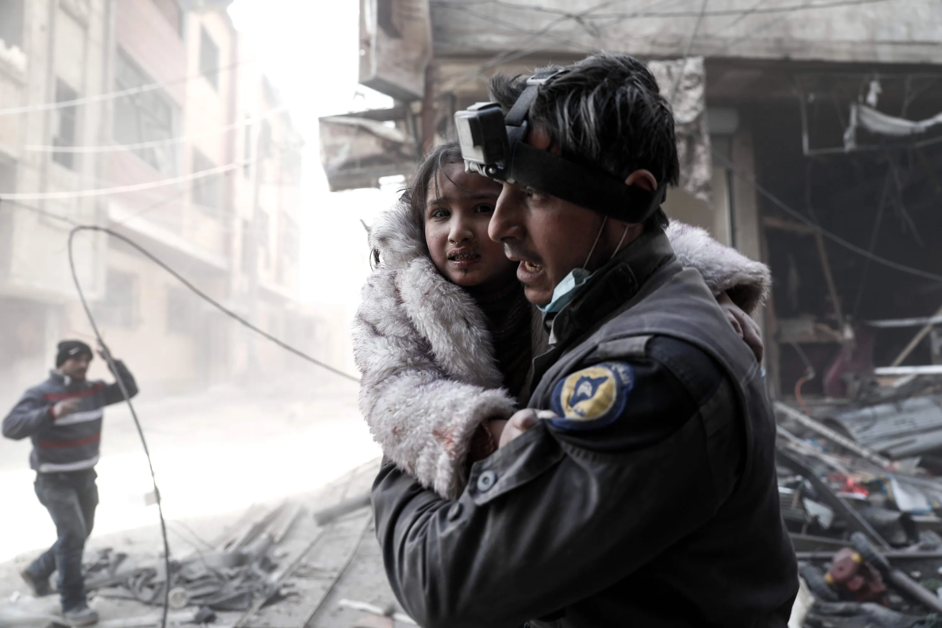 A member of the Syrian Civil Defence volunteers, also known as the White Helmets, carries a wounded girl amid the rubble following reported government airstrike on the rebel- held town of Douma, on the eastern outskirts of the capital Damascus, on February 25, 2017. Syrian regime forces carried out raids on several areas in the country, targeting mainly the besieged town of Douma, causing the deaths of at least 13 civilians, according to Syrian Observatory for Human Rights. (Photo by Sameer Al-Doumy/AFP Photo)