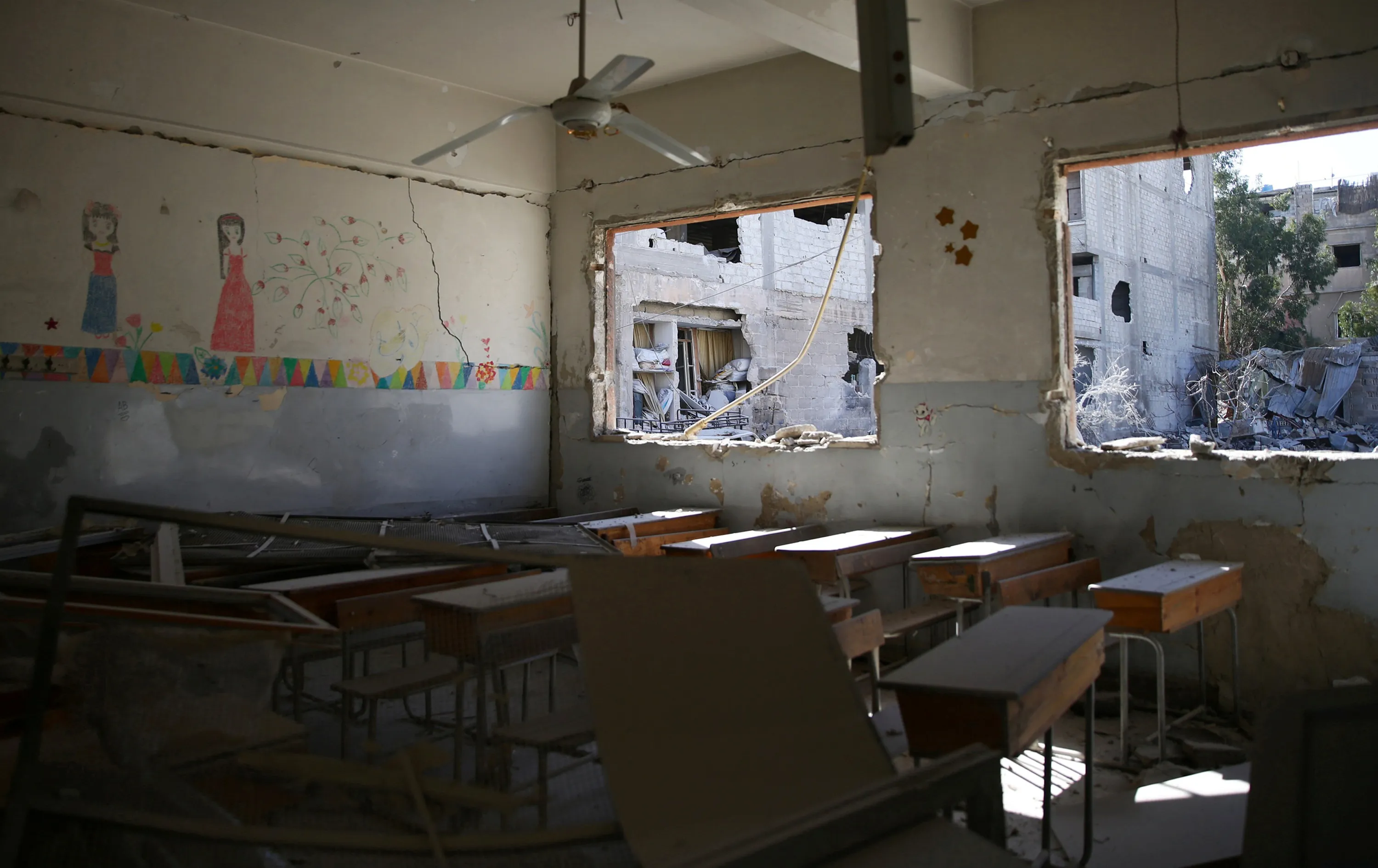 A damaged classroom is pictured after airstrikes in the rebel held besieged Douma neighbourhood of Damascus, Syria February 25, 2017. (Photo by Bassam Khabieh/Reuters)