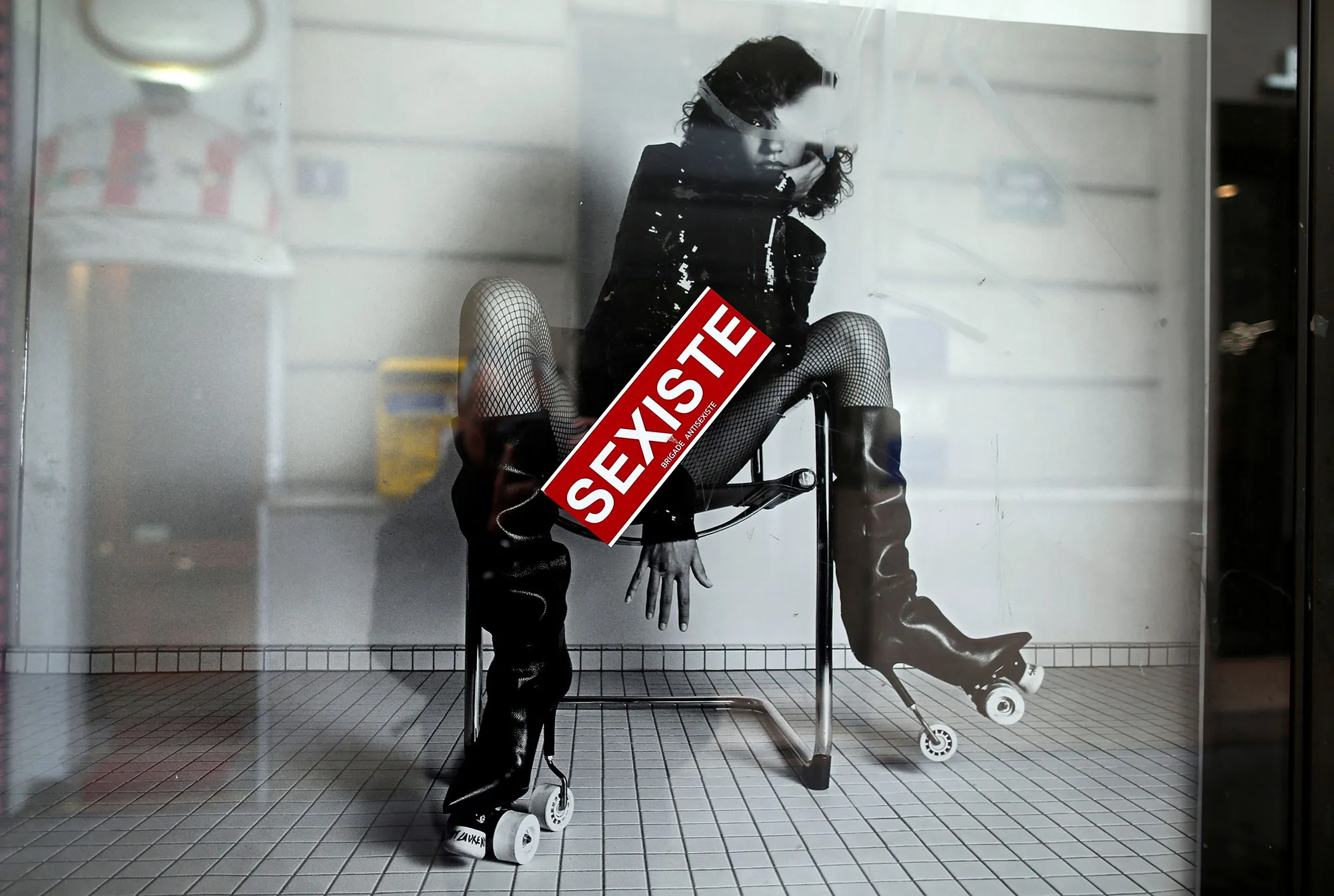 A sticker which reads “sеxist” is seen on an ad by French fashion house Yves Saint Laurent displayed on a newspaper kiosk in Paris, France, March 6, 2017. France's advertising watchdog on Monday said it had asked French fashion house Yves Saint Laurent to modify two ads from its latest campaign after receiving 50 complaints that they were “degrading” to women. (Photo by Charles Platiau/Reuters)