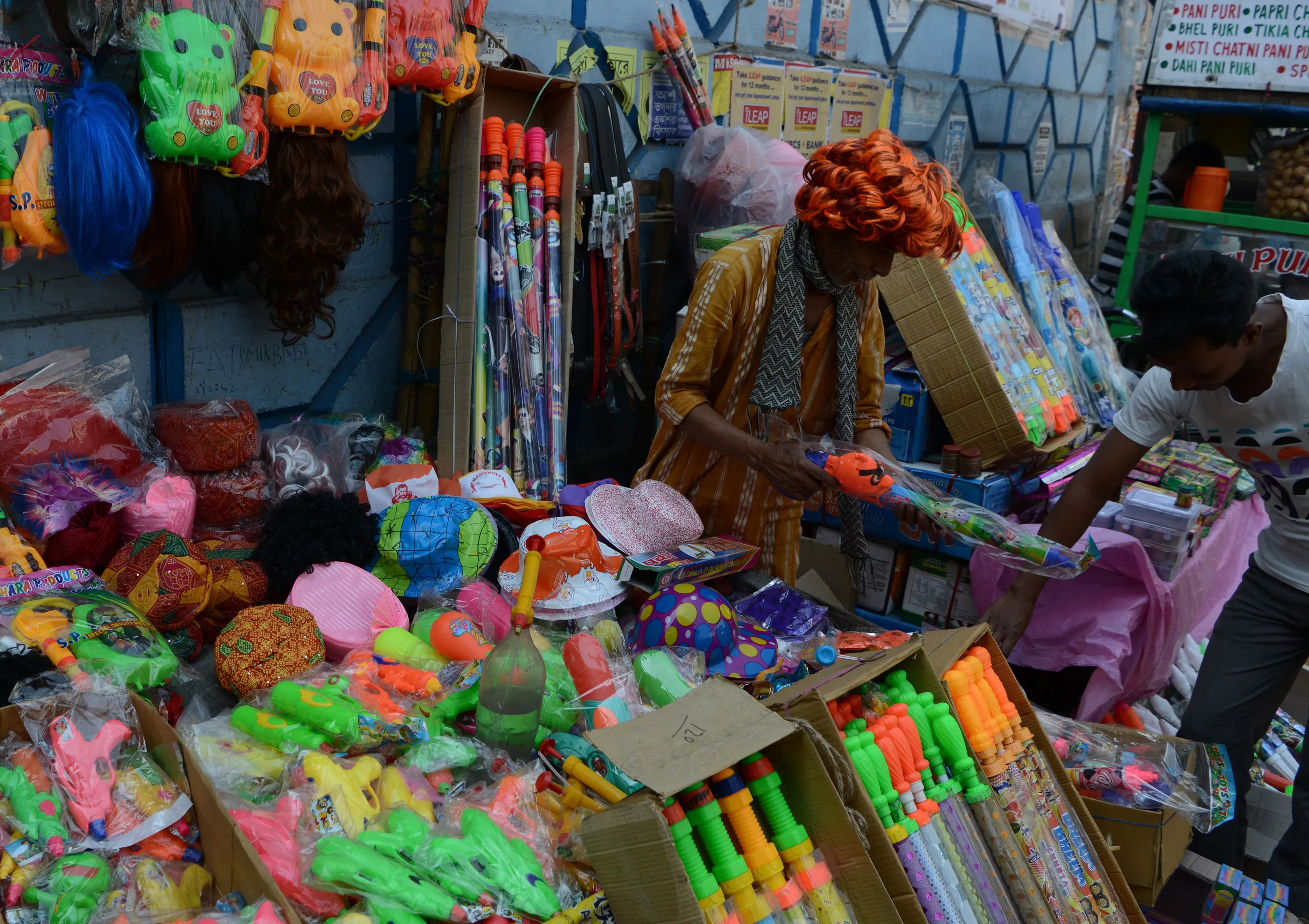 An Indian shopkeeper sells water guns at a roadside stall ahead of the Hindu festival of Holi in Siliguri on March 5, 2017. Holi, the popular Hindu spring festival of colours is observed in India at the end of the winter season on the last full moon of the lunar month and will be celebrated on March 13, this year. (Photo by Diptendu Dutta/AFP Photo)
