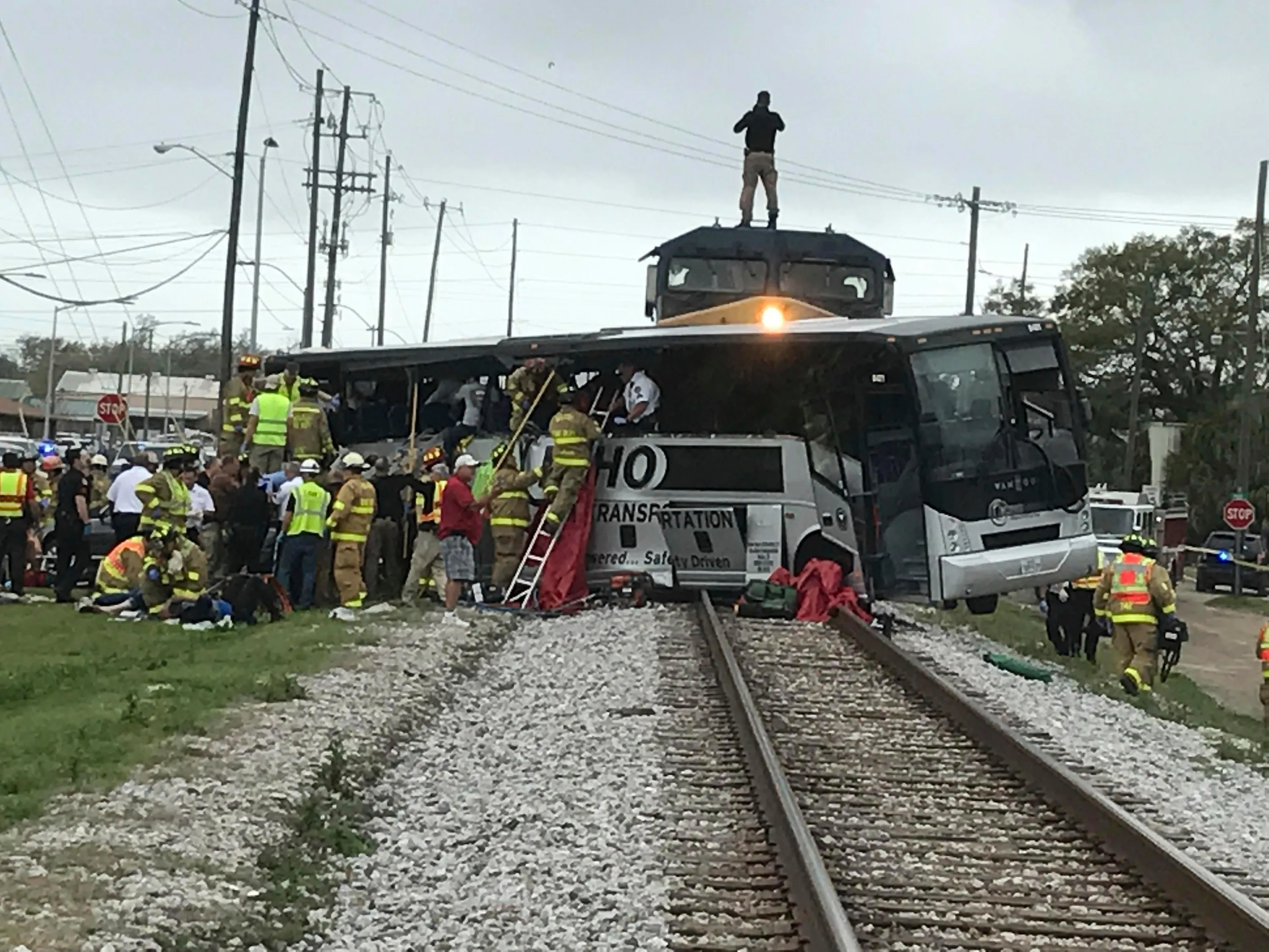 Biloxi firefighters assist injured passengers after their charter bus collided with a train in Biloxi, Miss., Tuesday, March 7, 2017. Biloxi city spokesman Vincent Creel says emergency responders were still removing injured people from the bus more than 30 minutes after the crash. (Photo by John Fitzhugh/The Sun Herald via AP Photo)