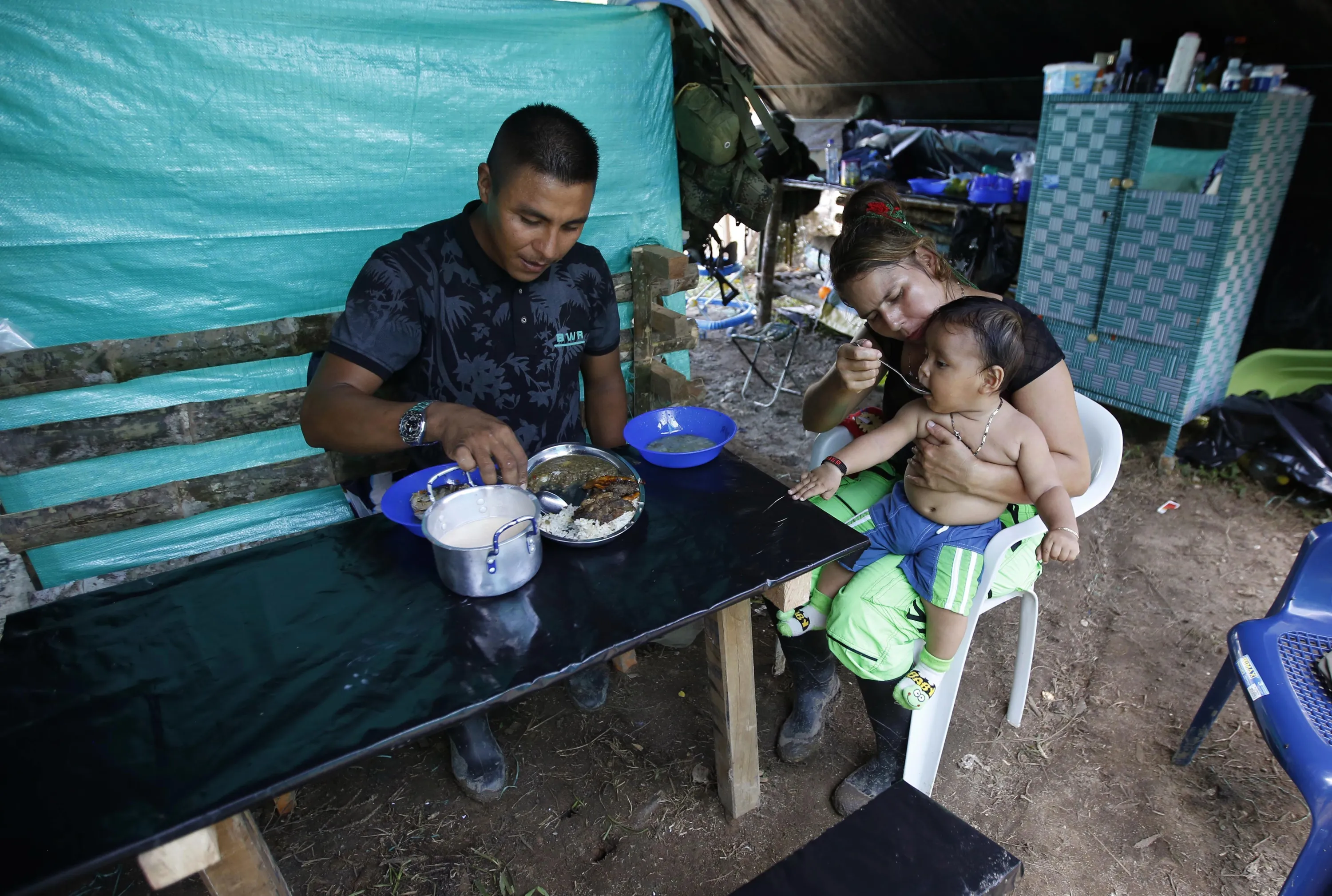 In this Tuesday, February 28, 2017, rebel couple Jerly Suarez, right, and Vicente Pulecio eat lunch with their 9-month-old son Dainer inside their rebel camp tent within a demobilization zone in La Carmelita in Colombia's southwestern Putumayo state. As the guerrilla army is preparing to lay down its weapons, a rebel baby boom has struck a chord among urban Colombians far removed from the conflict, a few of whom have mobilized to transport diapers and creams to the new mothers after seeing images of sweltering infants on cots in the rural encampments. (Photo by Fernando Vergara/AP Photo)