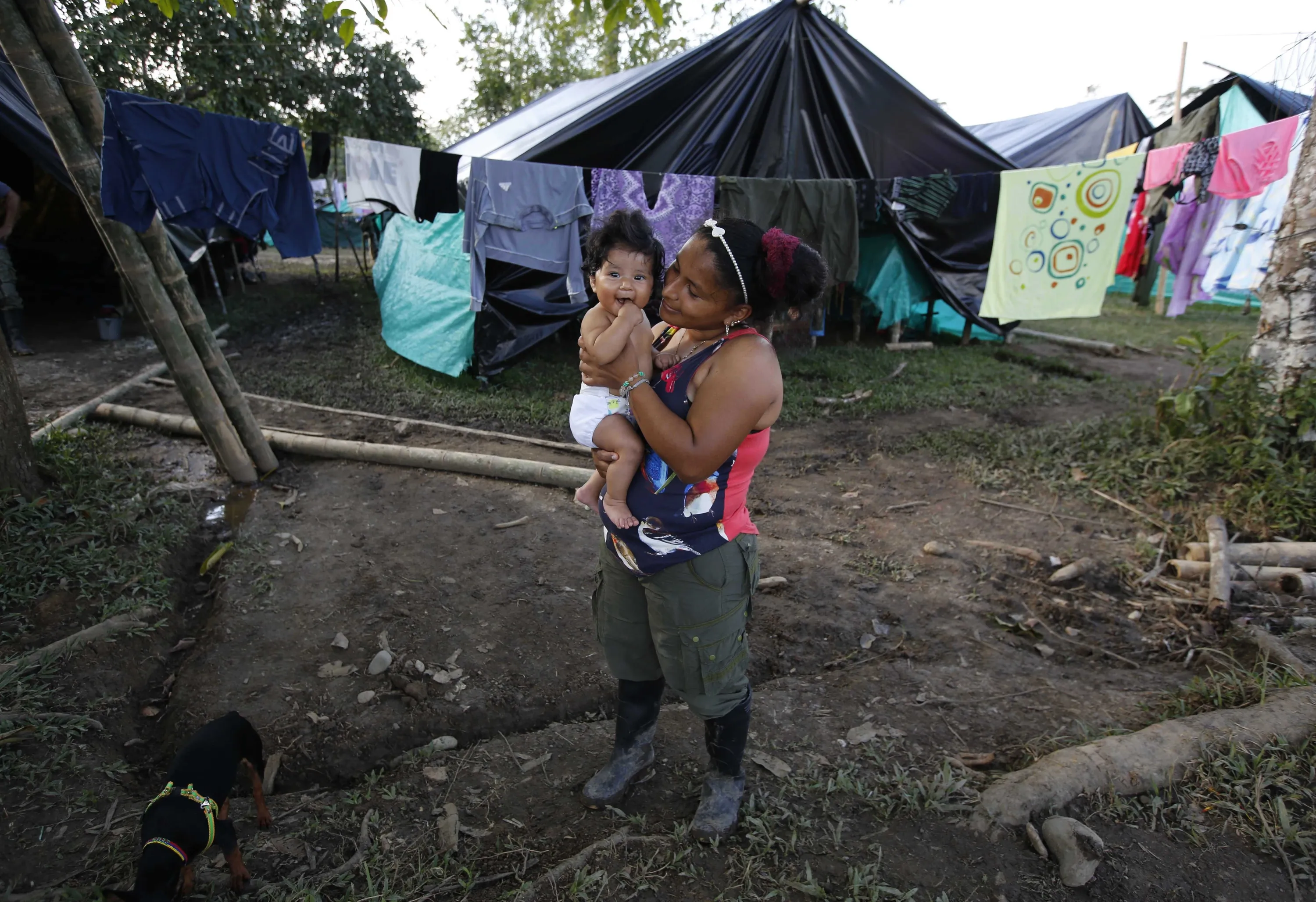 In this Tuesday, February 28, 2017 photo, FARC rebel Sandra Saez holds her 4-month-old daughter Manuela outside her tent at a rebel camp in a demobilization zone in La Carmelita, in Colombia's southwestern Putumayo state. Maternity was always a hot topic of discussion within the rebel ranks, and the practice of forbidding female fighters from keeping their children at the camps flew in the face of the rebels’ claim that by enrolling female warriors they were freeing women from traditional gender roles that restricted women’s choices, and it angered many in this devoutly Roman Catholic country. (Photo by Fernando Vergara/AP Photo)