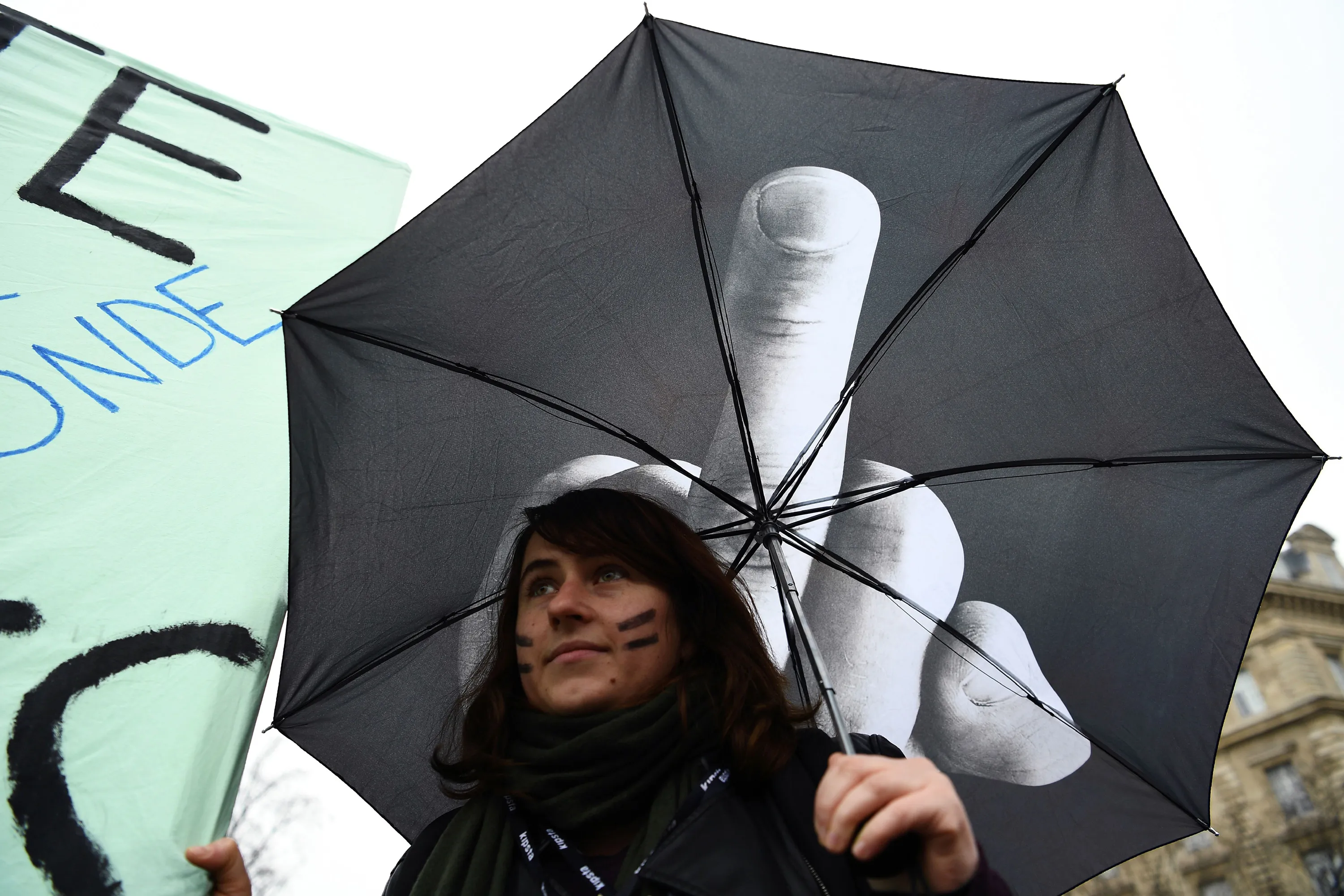 A woman holds an umbrella during a demonstration for the International Women's Day in Paris on March 8, 2017. (Photo by Gabriel Bouys/AFP Photo)