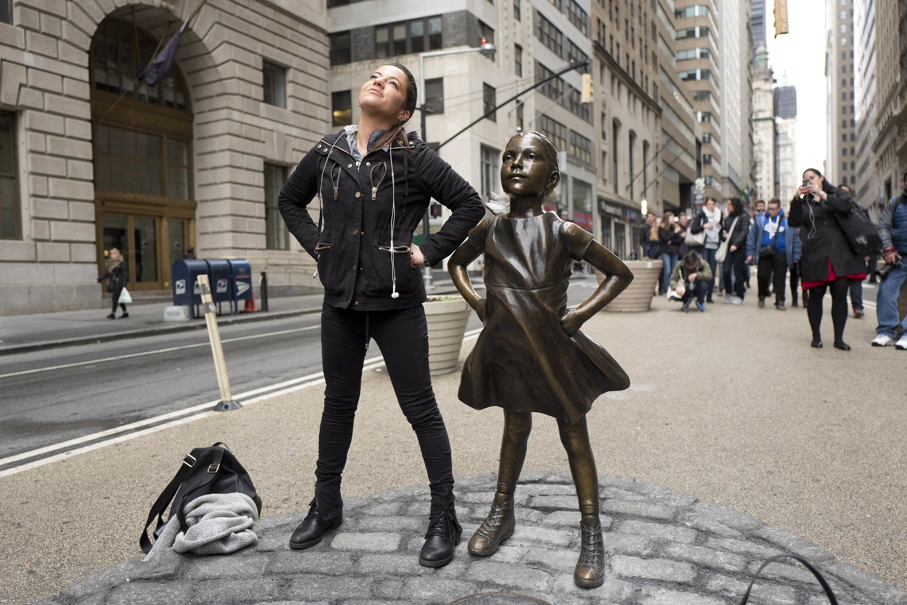 A woman strikes a pose in front of a statue titled “Fearless Girl” on Wednesday, March 8, 2017, in New York. A big investment firm, State Street Global Advisors, put the statue there to highlight International Women's Day. The work by artist Kristen Visbal. (Photo by Mark Lennihan/AP Photo)