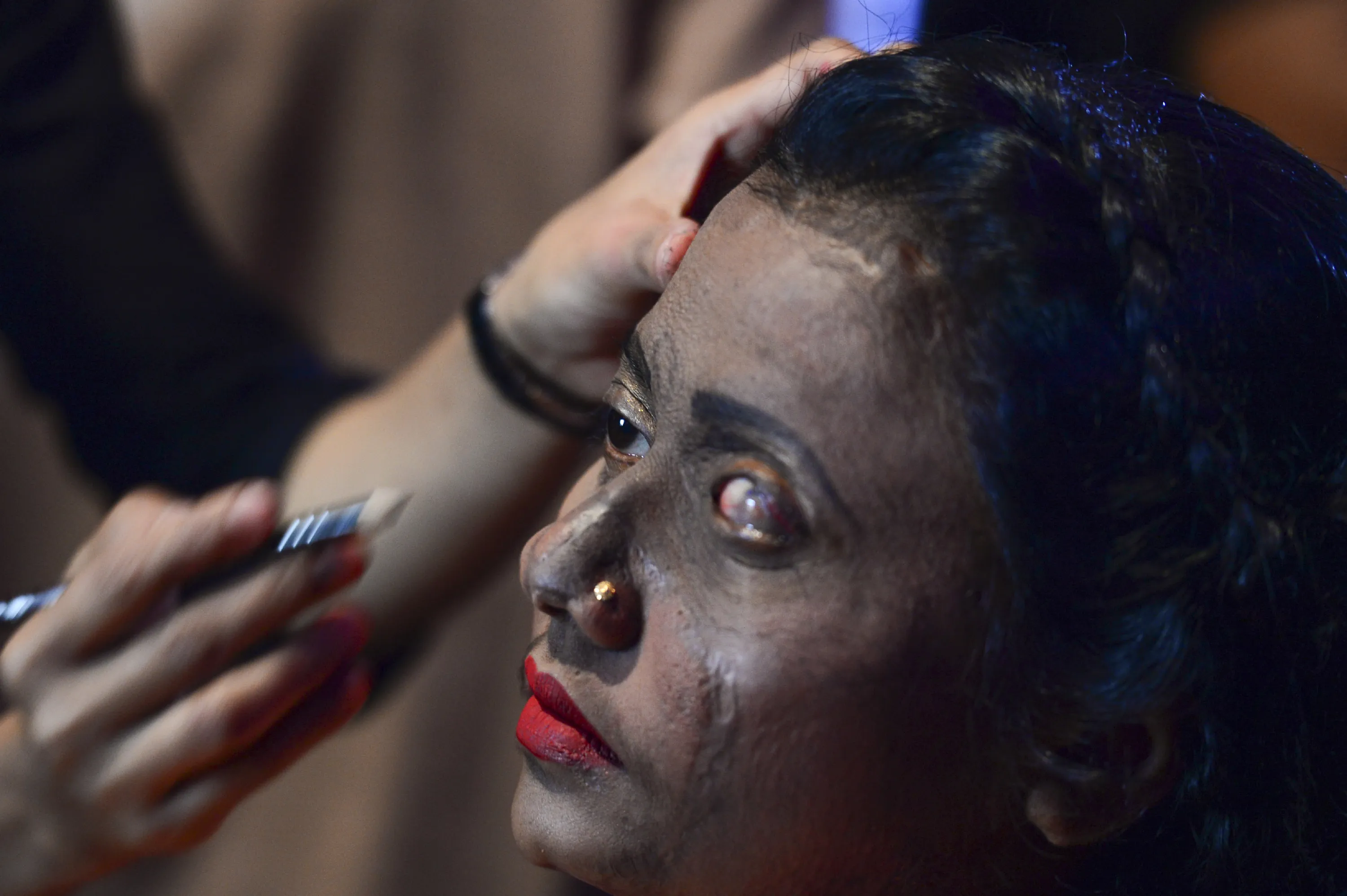 A Bangladeshi acid attack survivor has her makeup done backstage prior to the fashion show “Beauty Redefined” by designer Bibi Russell, featuring acid attack survivors in Dhaka on March 7, 2017. (Photo by AFP Photo/Stringer)