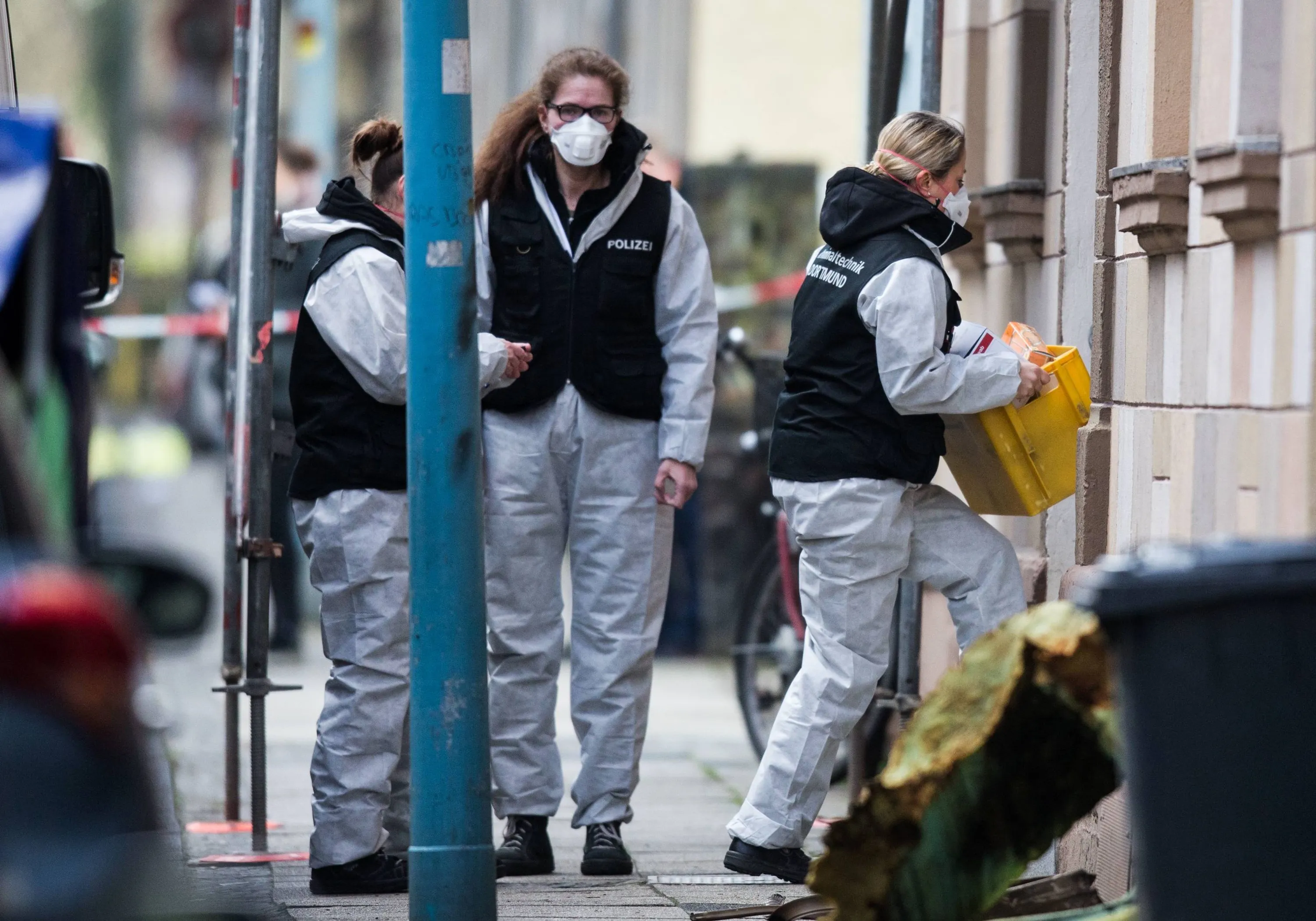 Forensic experts of the police secure evidences on March 10, 2017 from a house at Sedanstrasse street in Herne, western Germany, close to the place where a 19-year-old man suspected of stabbing a nine-year-old boy to death was arrested the night before. After his arrest, the suspected young man put the investigators on the trail of an apartment at Sedanstrasse he had just burned and in which the dead body of a man was found. (Photo by Marcel Kusch/AFP Photo/DPA)