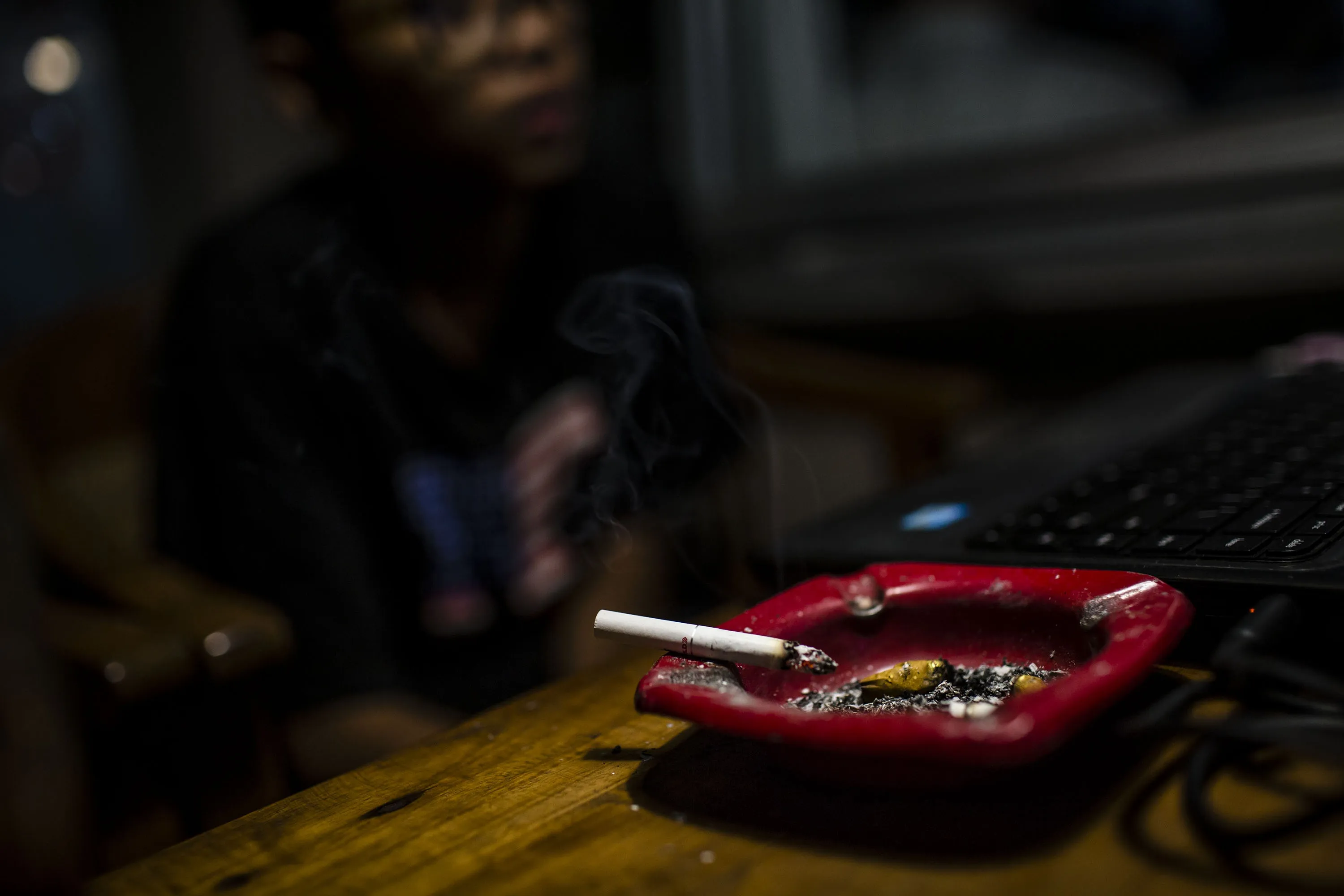 A cigarette is seen as a group of children smoking at a coffee shop on March 7, 2017 in Yogyakarta, Indonesia. (Photo by Ulet Ifansasti/Getty Images)