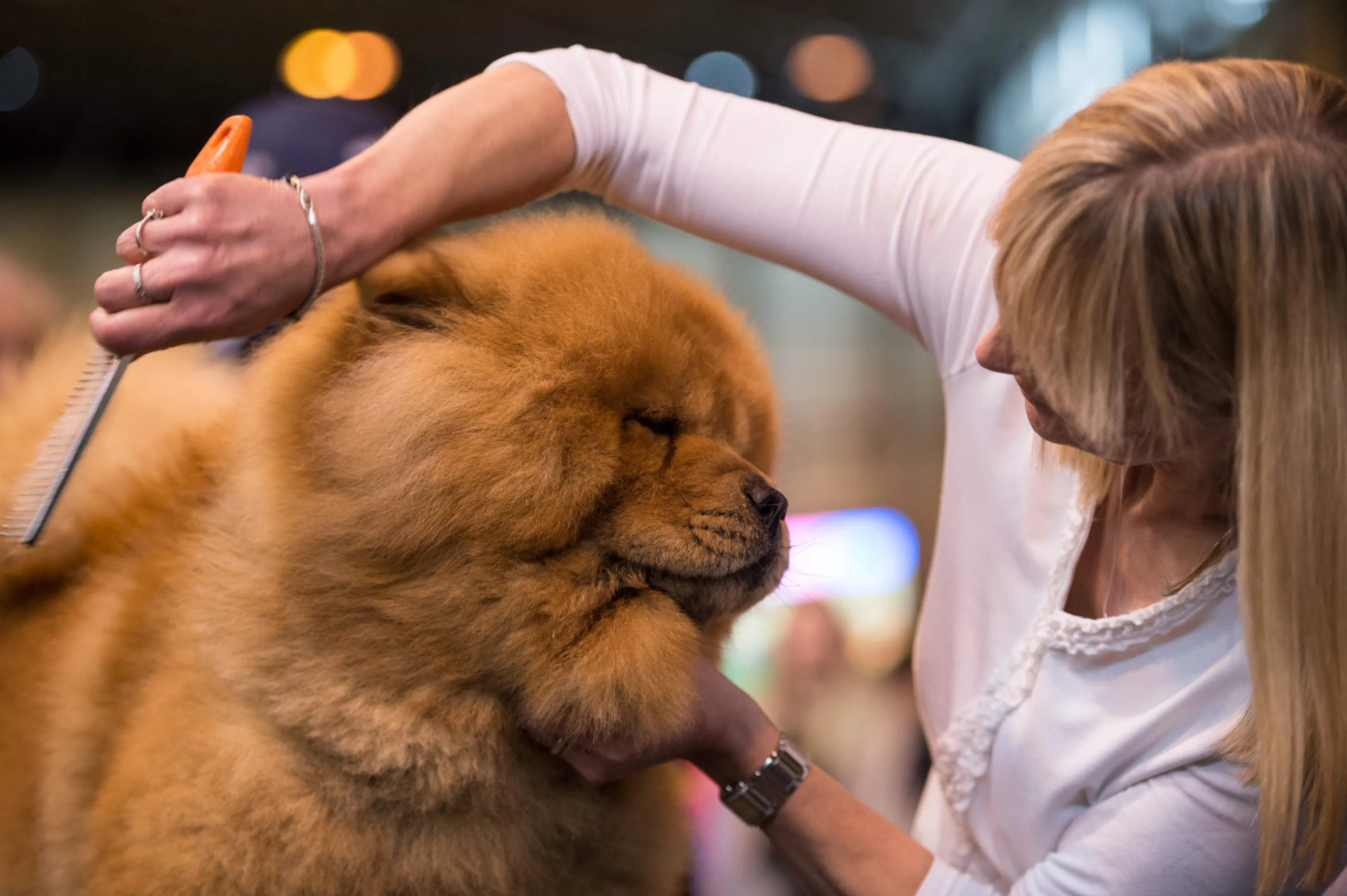A woman grooms her Chow Chow dog dog on the second day of the Crufts dog show at the National Exhibition Centre in Birmingham, central England, on March 10, 2017. (Photo by Oli Scarff/AFP Photo)