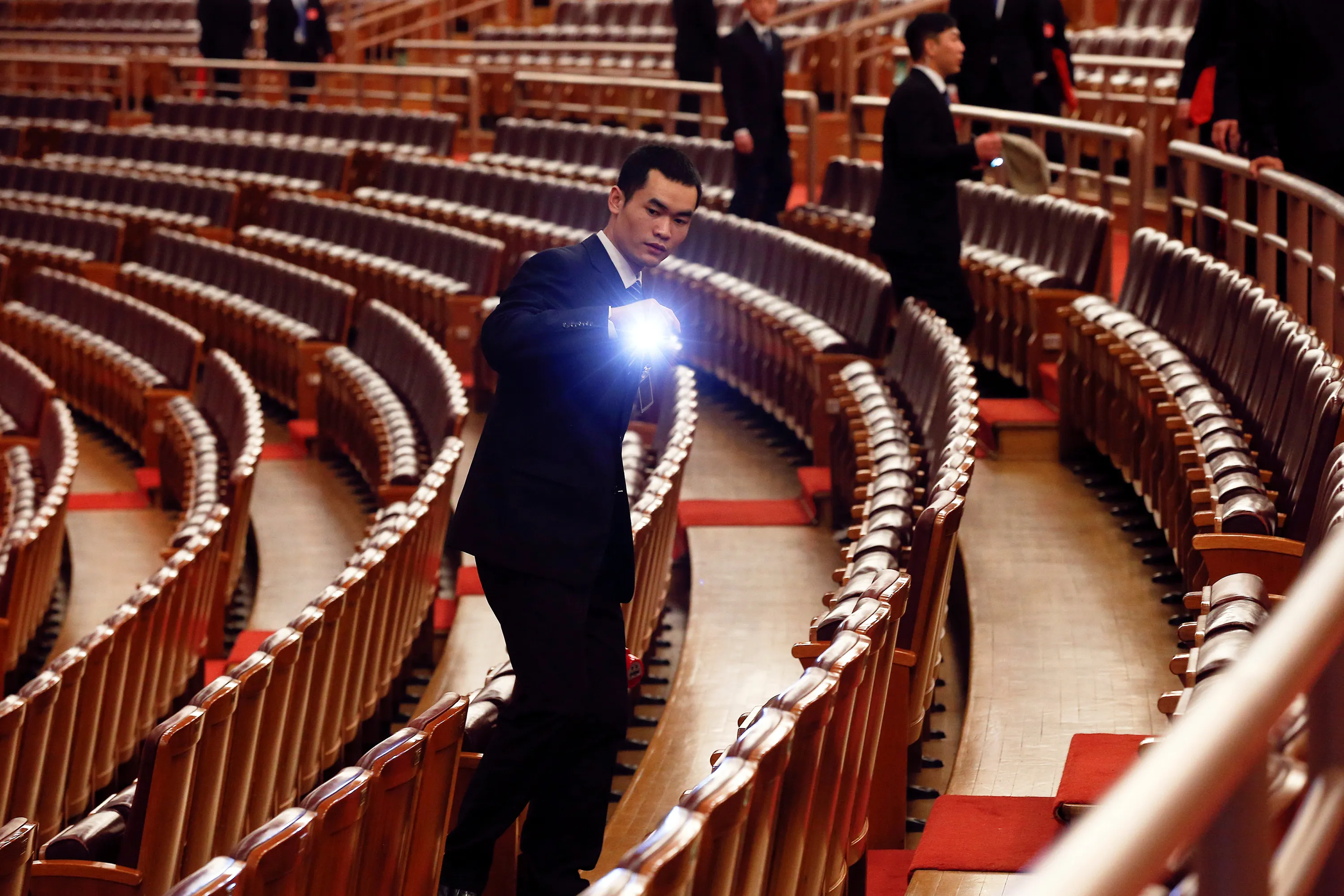 Security officers check inside the Great Hall of the People after the third plenary session of the National People's Congress (NPC) in Beijing, China, March 12, 2017. (Photo by Tyrone Siu/Reuters)