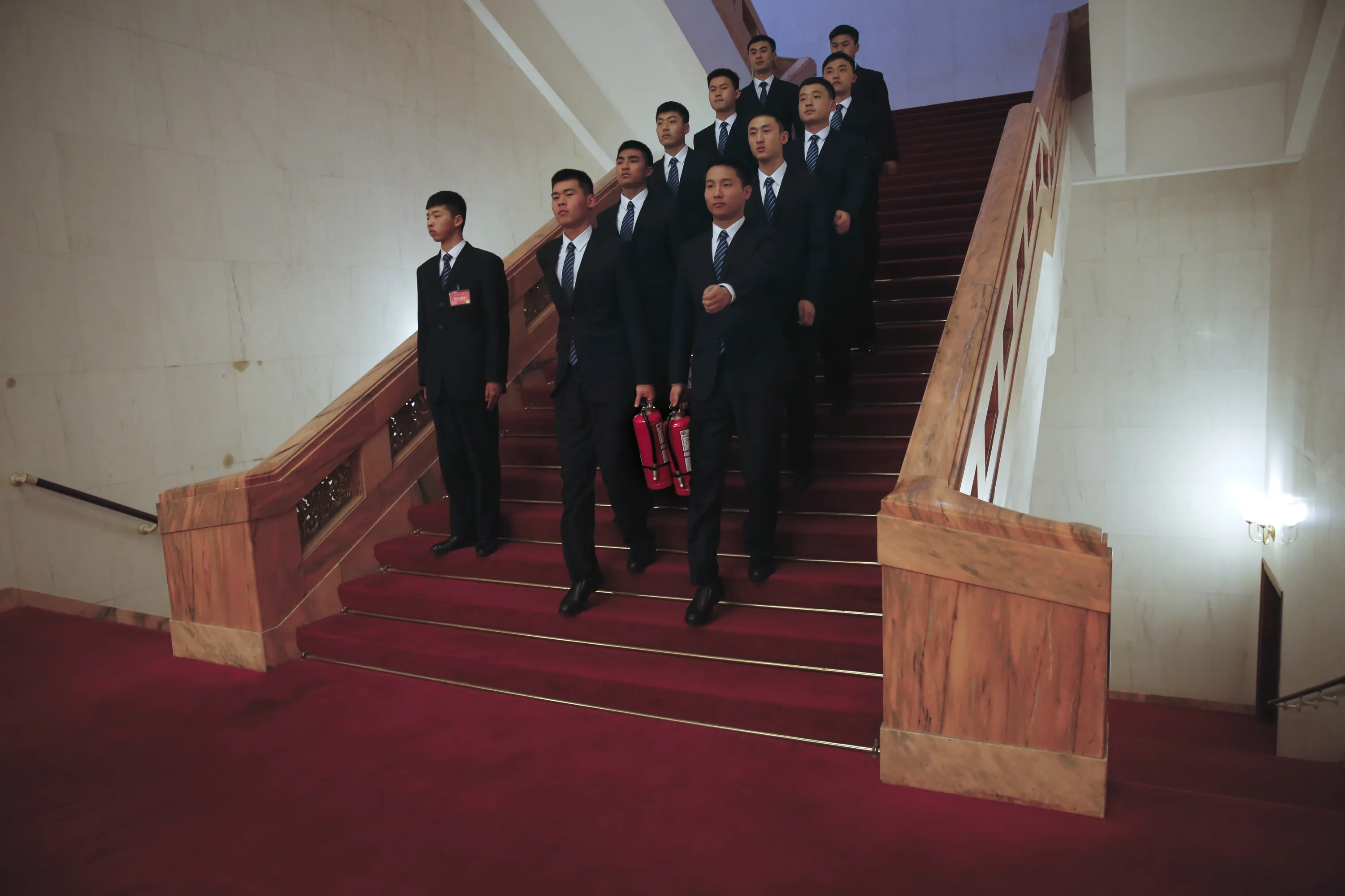 In this Friday, March 10, 2017 photo, soldiers in usher uniforms, some carry fire extinguishers march down a staircase after the Chinese People's Political Consultative Conference (CPPCC) at the Great Hall of the People in Beijing. Because safety comes first, fire extinguishers are ubiquitous in and around Beijing’s Great Hall of the People during the annual sessions of China’s ceremonial parliament and its official advisory body. That’s partly for standard purposes of preventing any sort of fire-related emergency that could harm the participants and mar the proceedings. (Photo by Andy Wong/AP Photo)