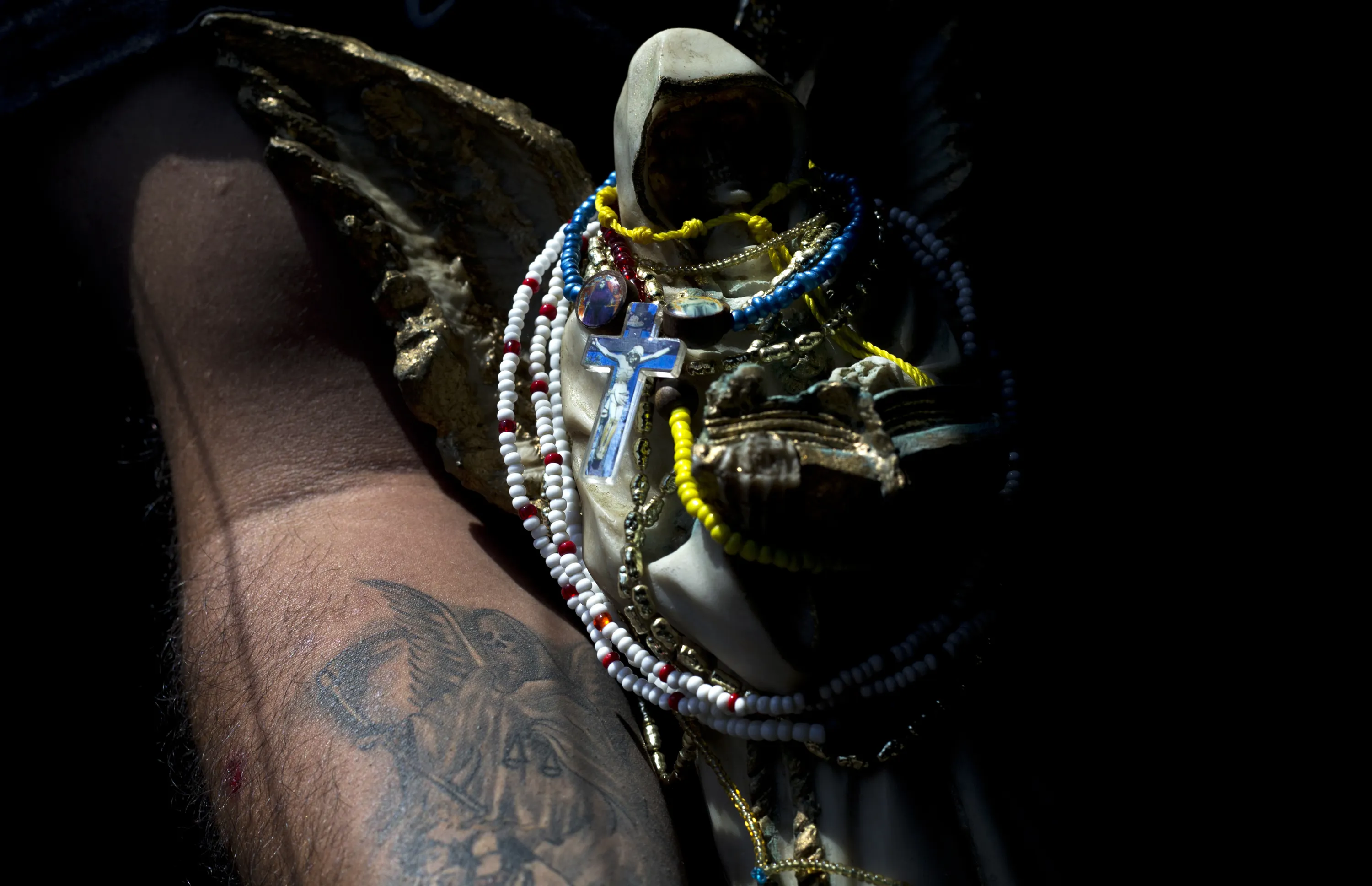 In this March 1, 2017 photo, a devotee of the Death Saint or “Santa Muerte”, who has a tattoo of the folk saint, holds his statuette during a pilgrimage in Mexico City's Tepito neighborhood. When Pope Francis visited Mexico last year he expressed concern for those who “praise illusions and embrace their macabre symbols to commercialize death in exchange for money”. (Photo by Marco Ugarte/AP Photo)