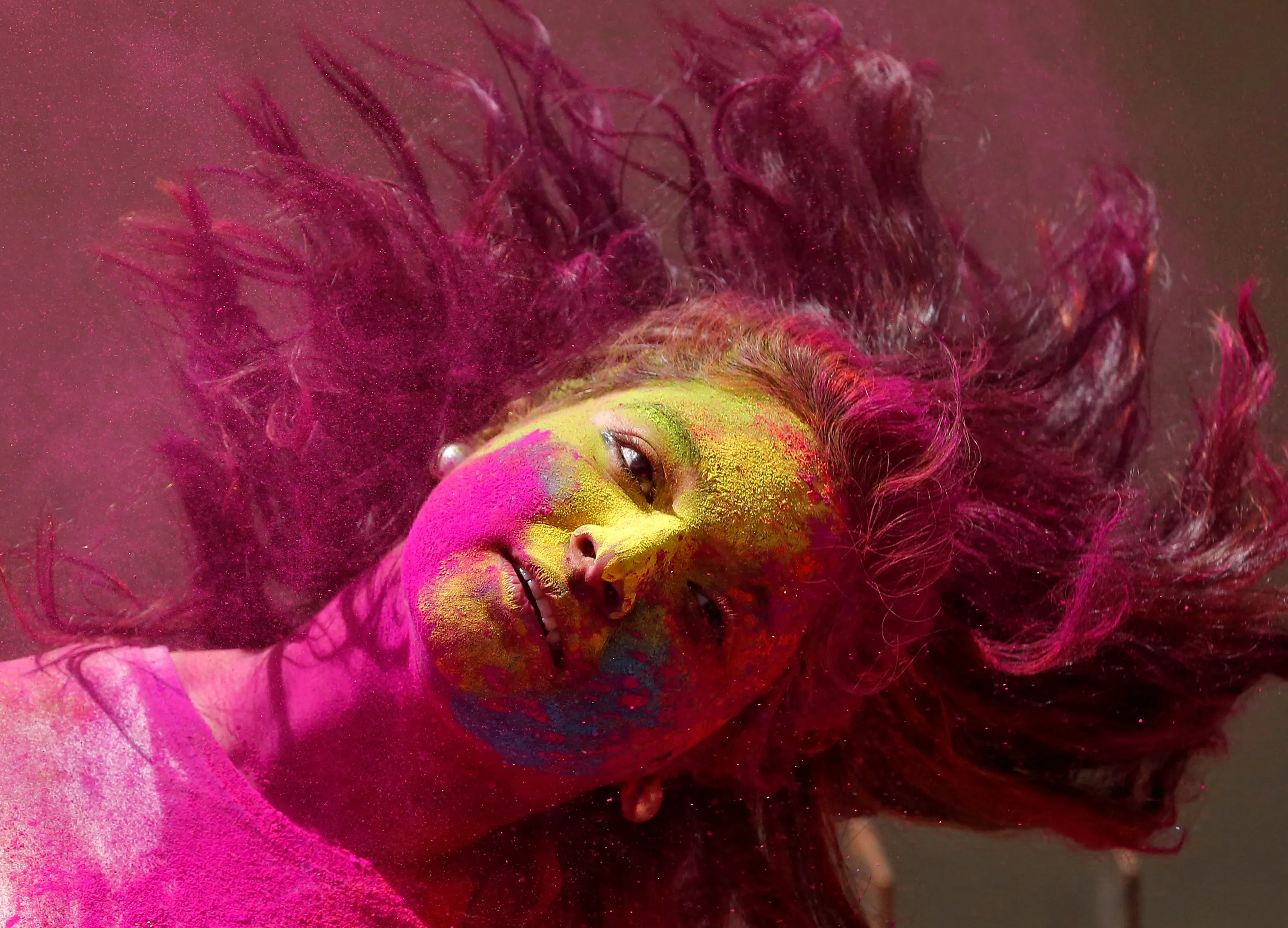 A woman smeared with coloured powder shakes her head to remove it after it was applied on her while celebrating Holi, the Festival of Colours, in Mumbai, March 13, 2017. (Photo by Shailesh Andrade/Reuters)