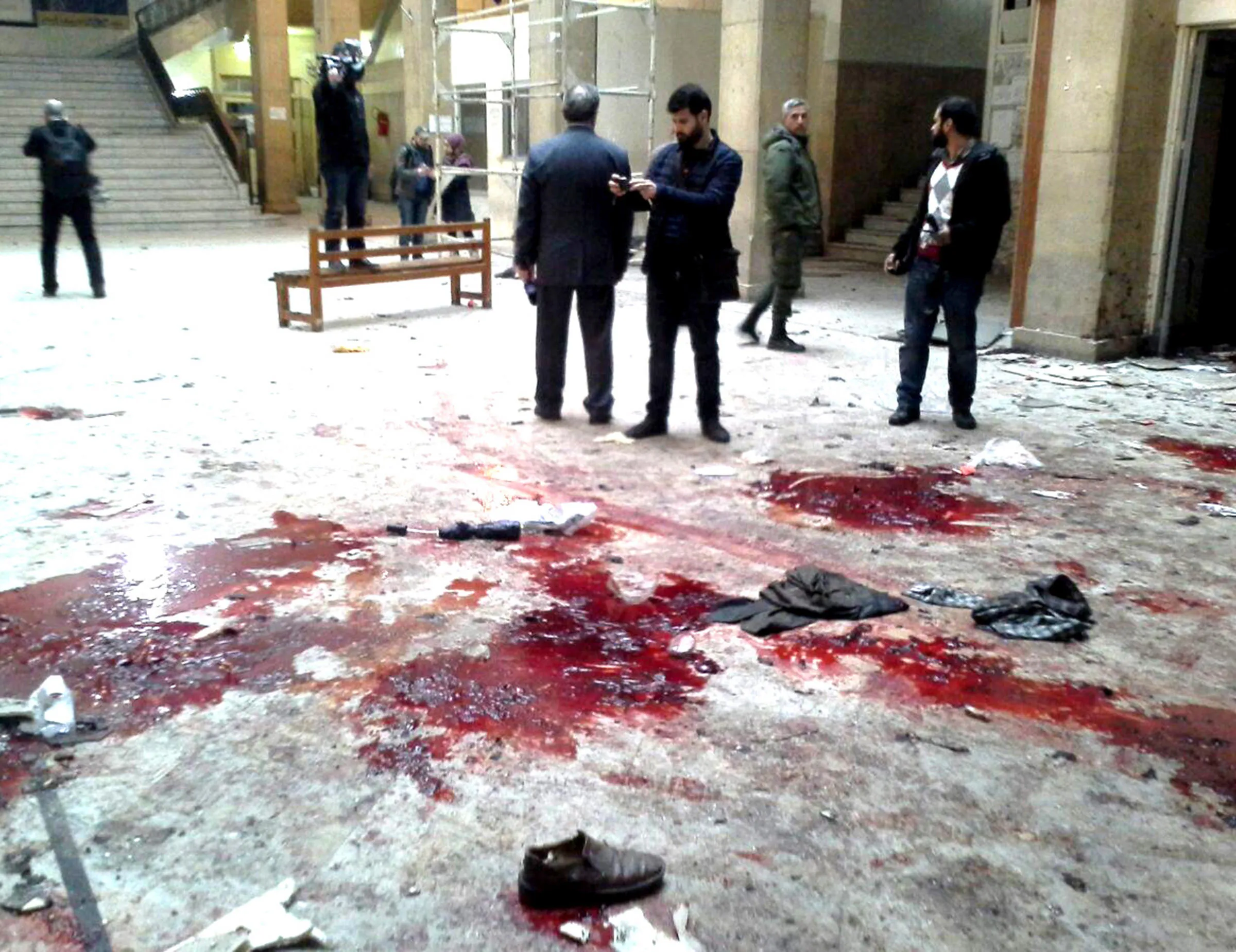 In this photo released by the Syrian official news agency SANA, journalists gather next of blood inside the main judicial building which attacked by a suicide bomber, in Damascus, Syria, Wednesday, March 15, 2017. (Photo by SANA via AP Photo)