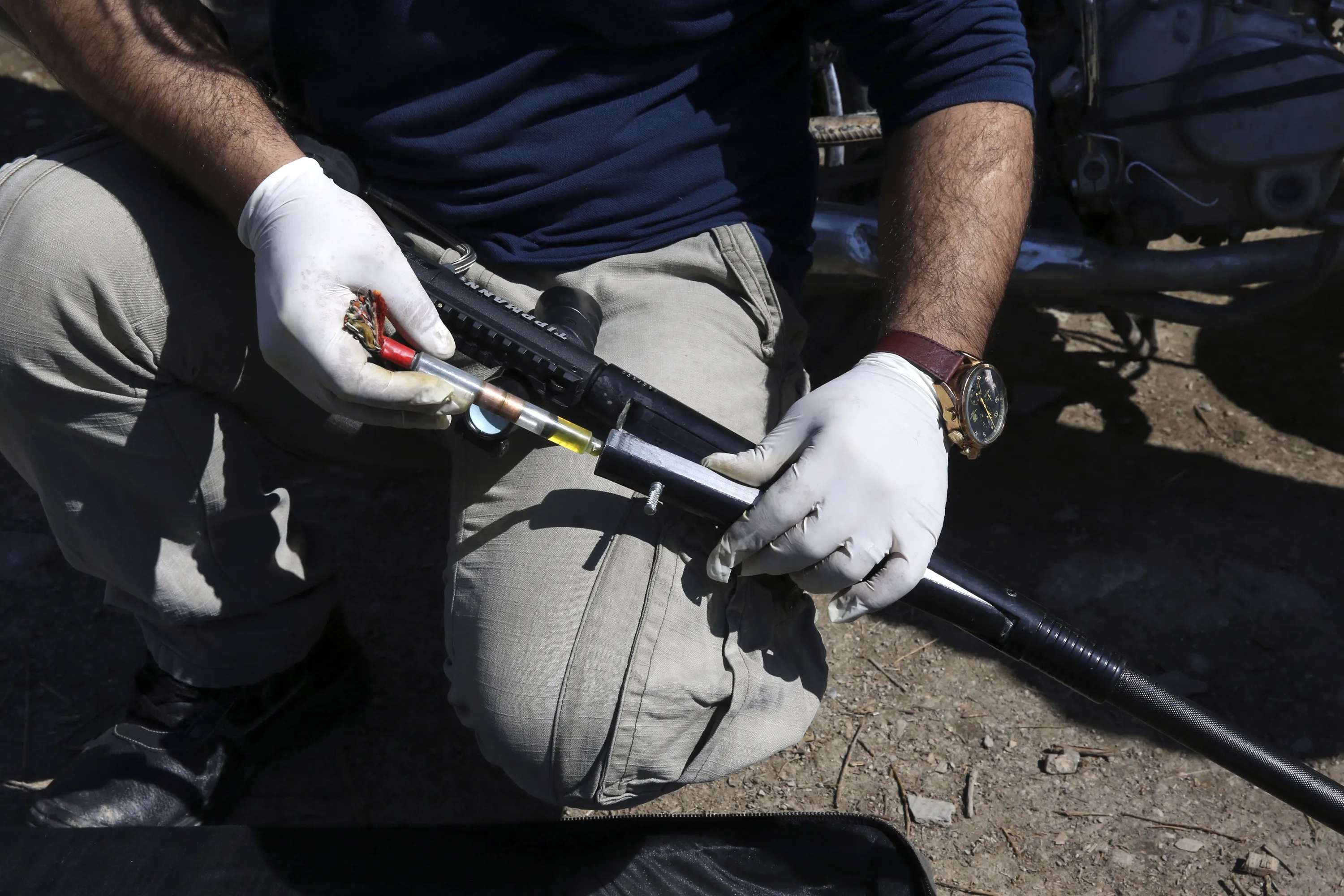 In this picture taken on Sunday, March 5, 2017, a Tehran urban animal control worker puts an anesthetic dart syringe into his gun to shoot stray dogs on the outskirts of the capital Tehran, Iran. (Photo by Vahid Salemi/AP Photo)