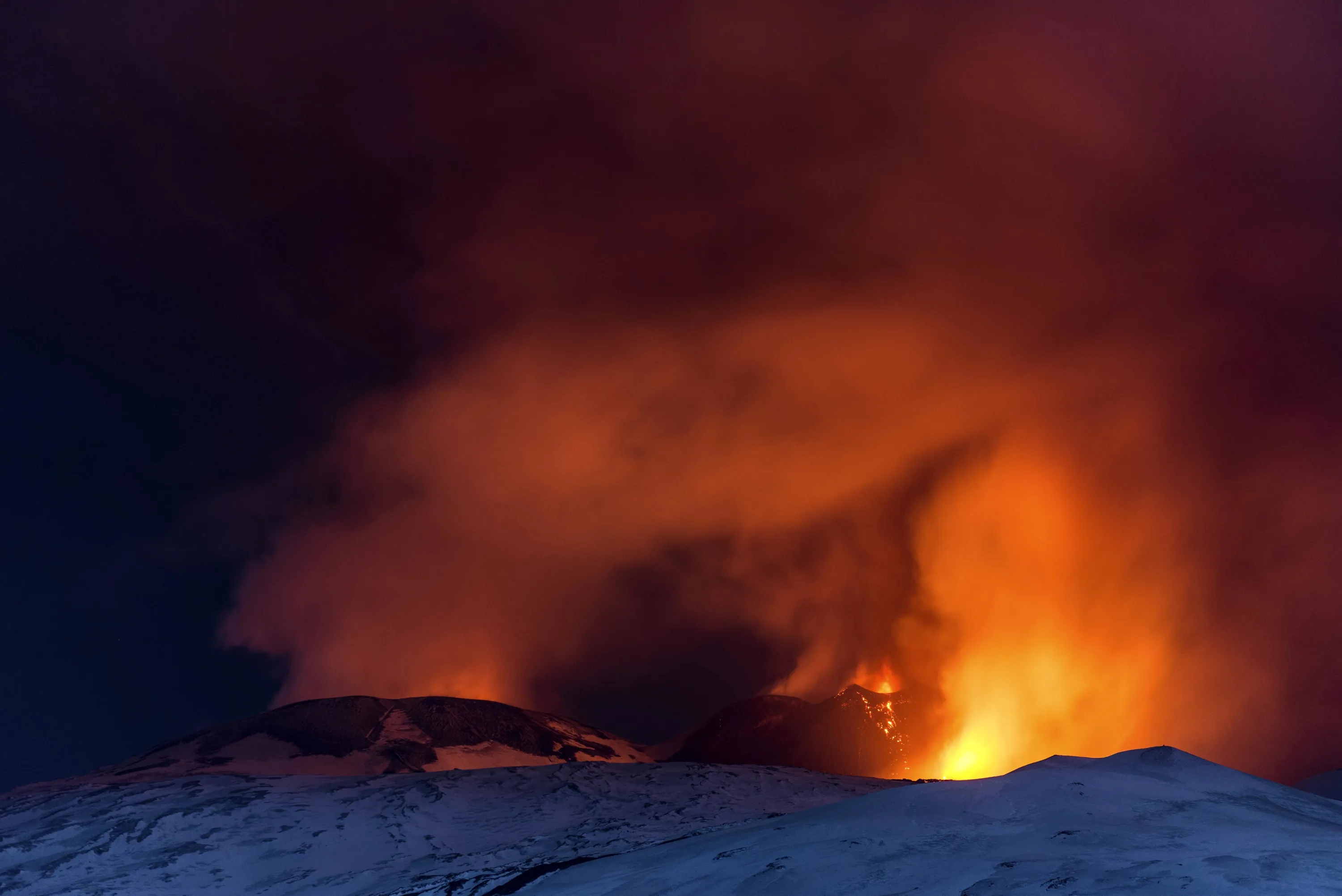 Snow-covered Mount Etna, Europe's most active volcano, spews lava during an eruption in the early hours of Thursday, March 16, 2017. A new eruption which began on March 15 is causing no damages to Catania's airport which is fully operational. (Photo by Salvatore Allegra/AP Photo)