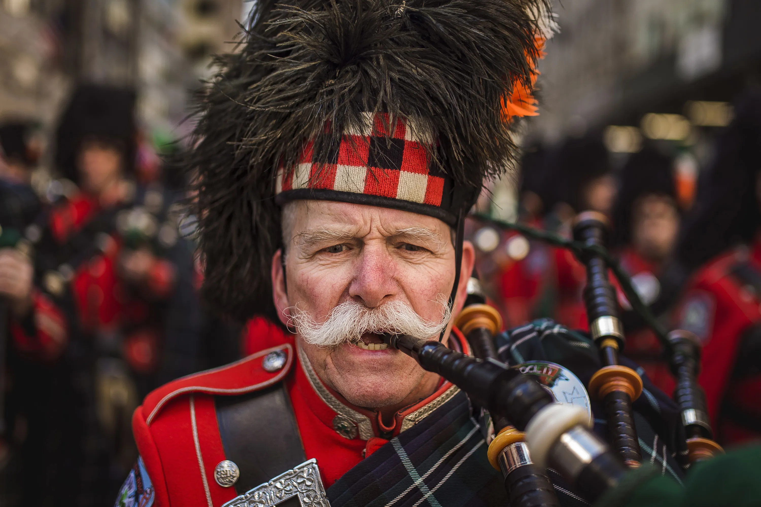 Bagpipers march up Fifth Avenue during the St. Patrick's Day Parade, Friday, March 17, 2017, in New York. New York City was awash in green and Irish pride as throngs celebrated at the annual parade. (Photo by Andres Kudacki/AP Photo)