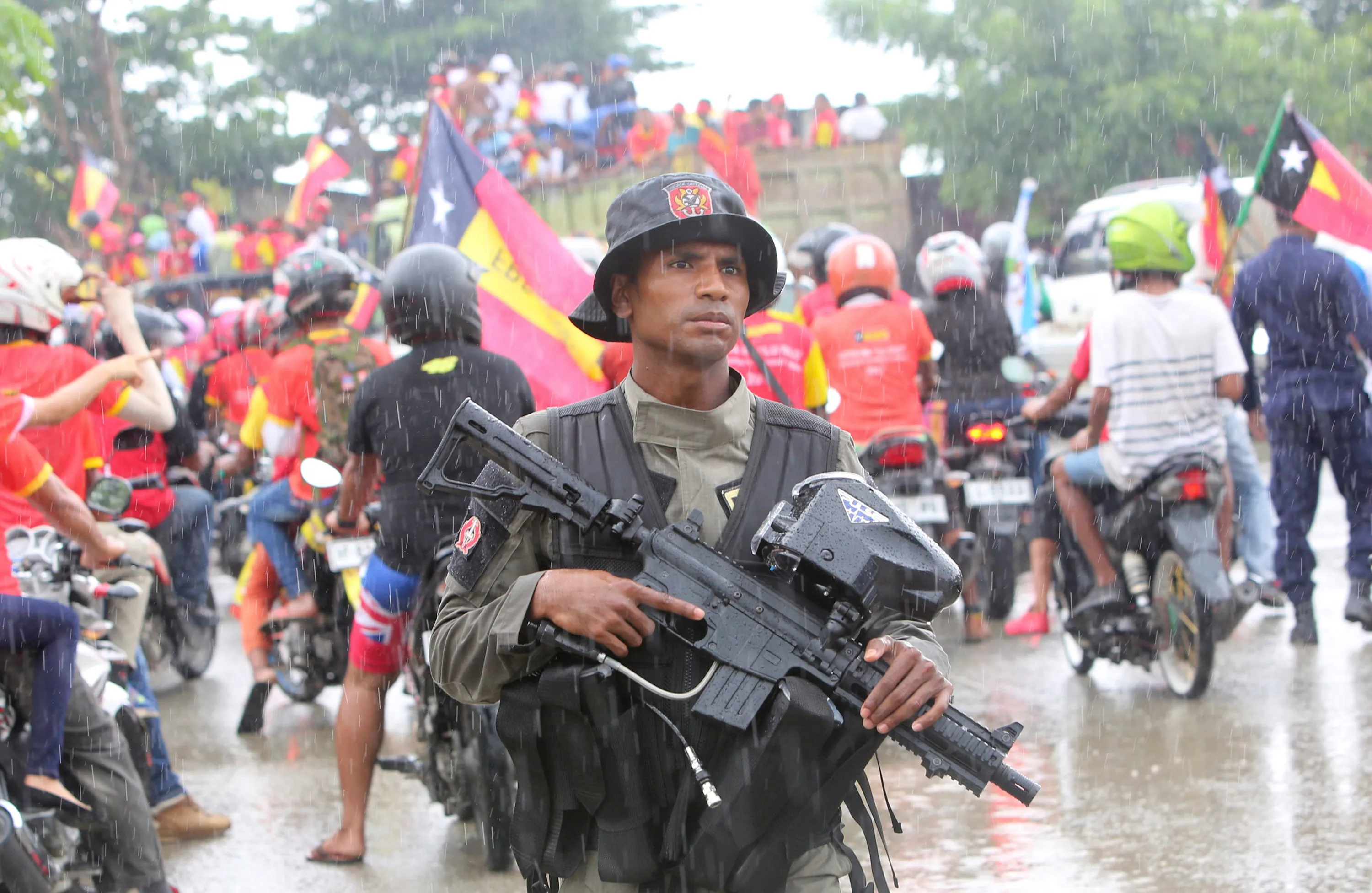A policeman stands guard on March 17, 2017 as supporters of presidential candidate Francisco Guterres from the Revolutionary Front for an Independent East Timor party ride through the street campaigning ahead of next week’s elections in Dili, East Timor. (Photo by Lirio Da Fonseca/Reuters)