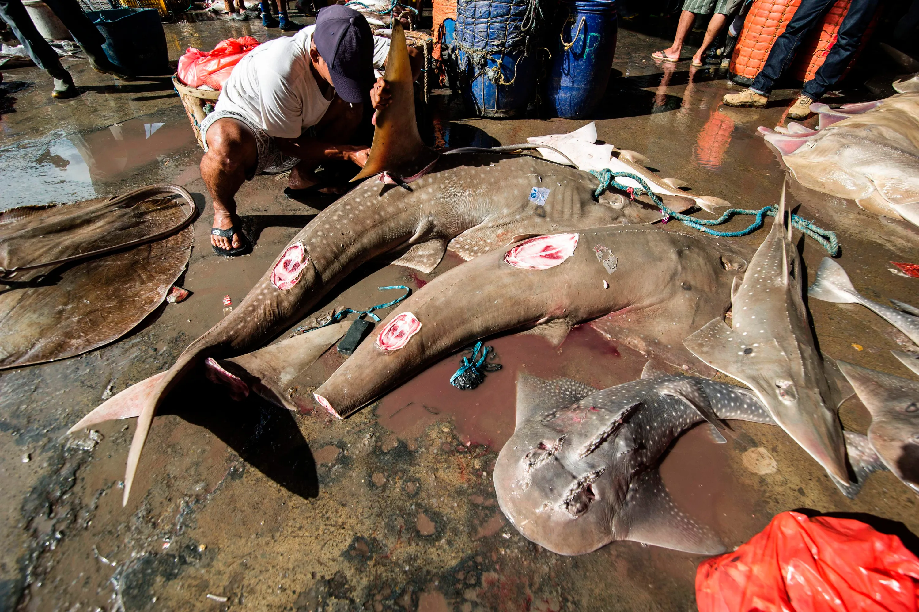 Indonesian fishermen process their catch which include sharks at a fishing village in Brondong, East Java on March 13, 2017. Indonesia, the world' s largest archipelago, ranks among the largest producers of aquaculture worldwide with the government setting a target to achieve 31 million tons of fish from the industry by 2019, a two- fold increase compared to the current yearly production, with an estimated value of 65.8 trillion rupiah (USD 28.67 billion). (Photo by Juni Kriswanto/AFP Photo)