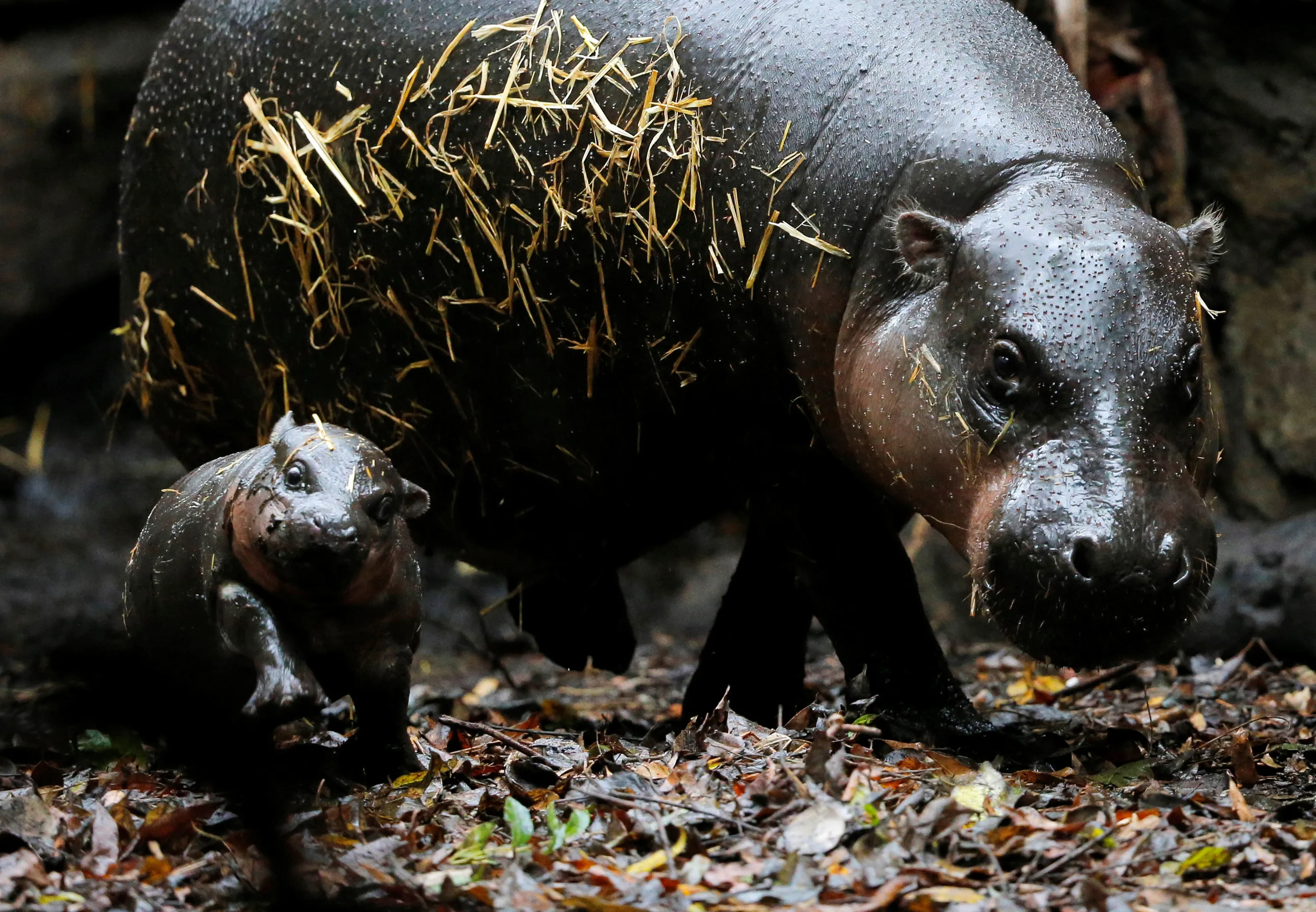 Taronga Zoo's yet-unnamed Pygmy Hippo calf, born on February 21, goes on public display for the first time in alongside her mother Kambiri in Sydney, Australia, March 17, 2017. (Photo by Jason Reed/Reuters)