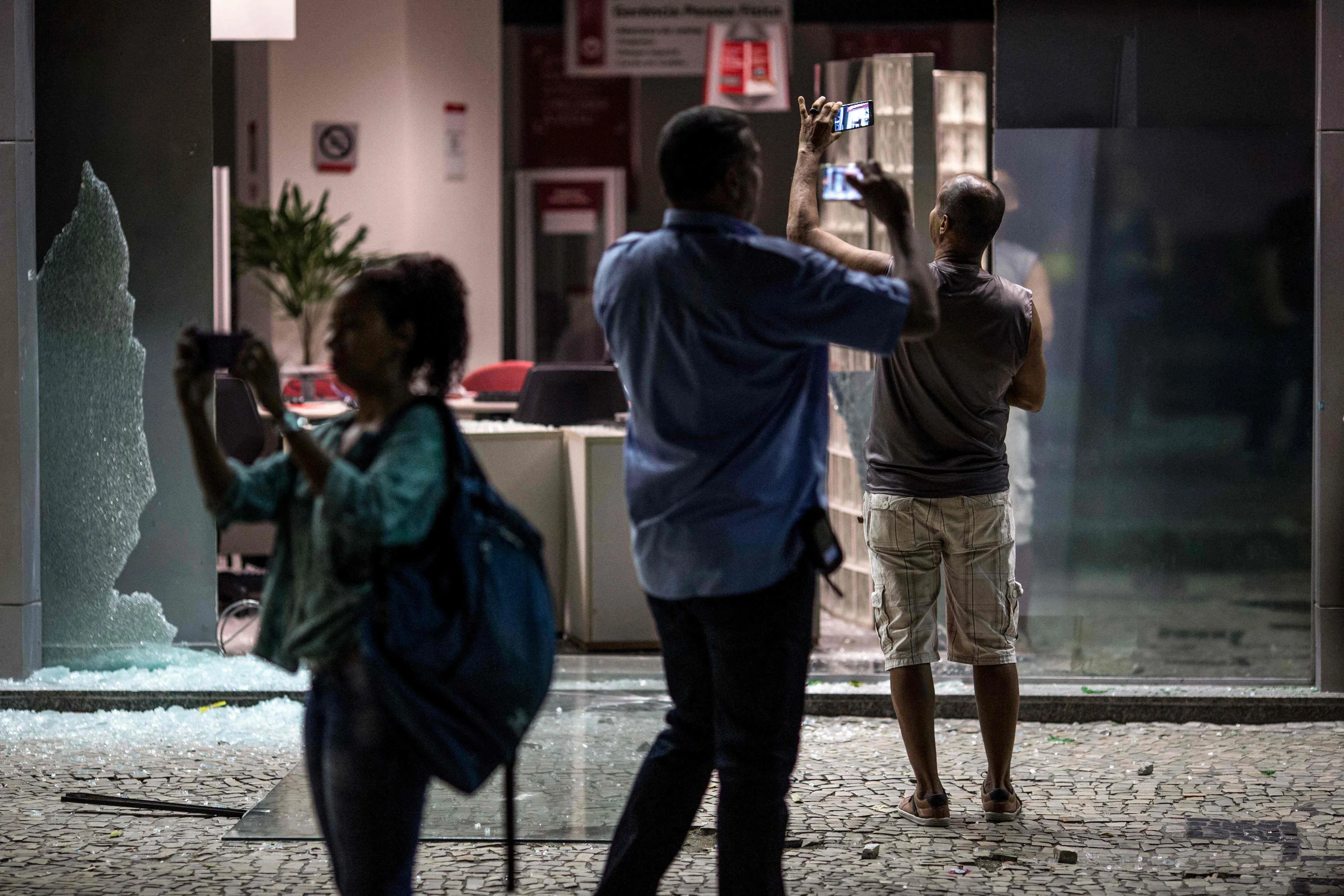 People take pictures of the entrance of a bank vandalized by protesters during a national strike against the government' s social welfare reform bill which seeks to extend the time of contributions and raise the minimum age required to obtain full retirement benefits, in Rio de Janeiro, Brazil, on March 15, 2017 Since replacing leftist President Dilma Rousseff in Congress in 2016, President Michel Temer has been pushing for an adjustment program aimed at regaining market confidence and reactivating the country' s economy, in recession for more than two years. (Photo by Mauro Pimentel/AFP Photo)