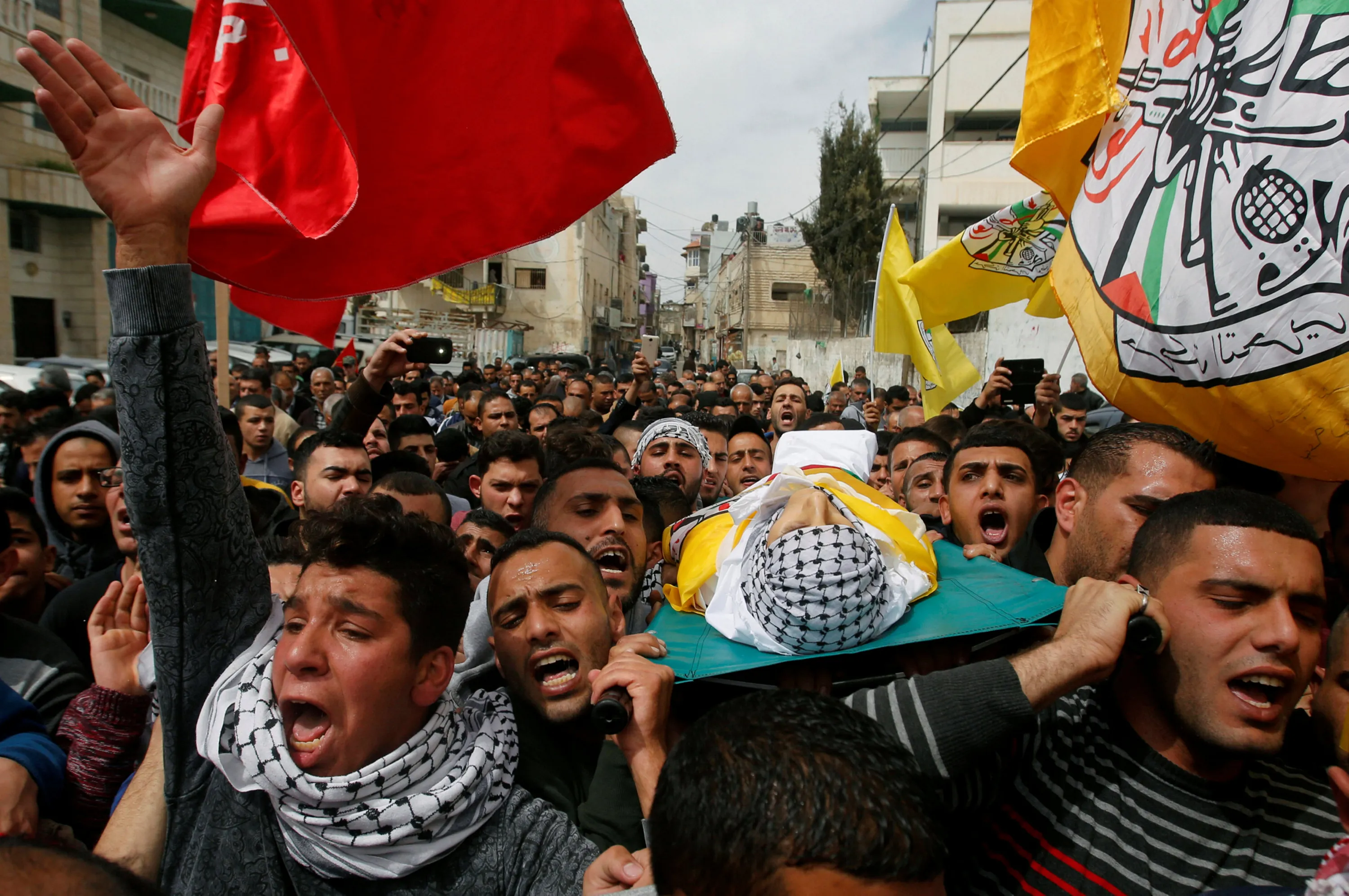 Mourners carry the body of Palestinian youth Morad Abu Ghazi, who was killed by Israeli troops during clashes, during his funeral in al-Arroub refugee camp near the West Bank city of Hebron March 18, 2017. (Photo by Mussa Qawasma/Reuters)