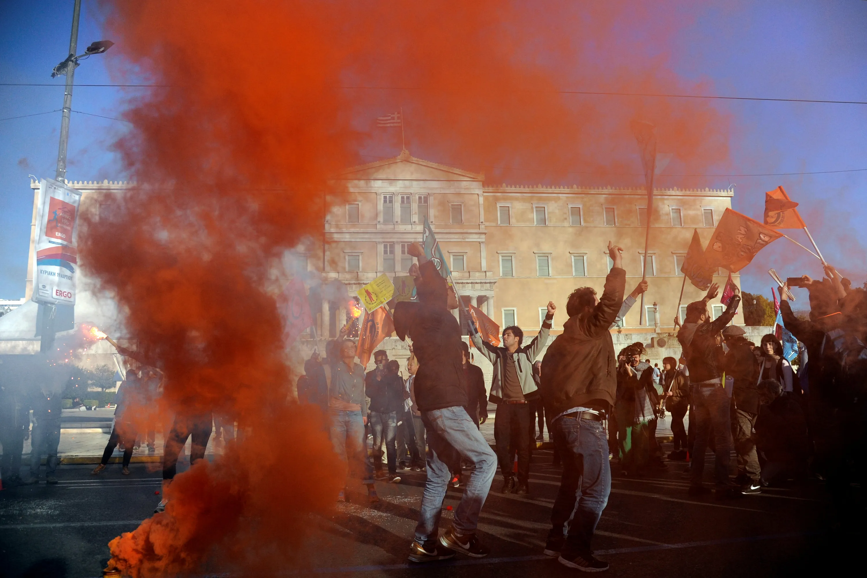 A flare is lit in front of the parliament as activists take part in an anti-racism rally in Athens, Greece, March 18, 2017. (Photo by Michalis Karagiannis/Reuters)