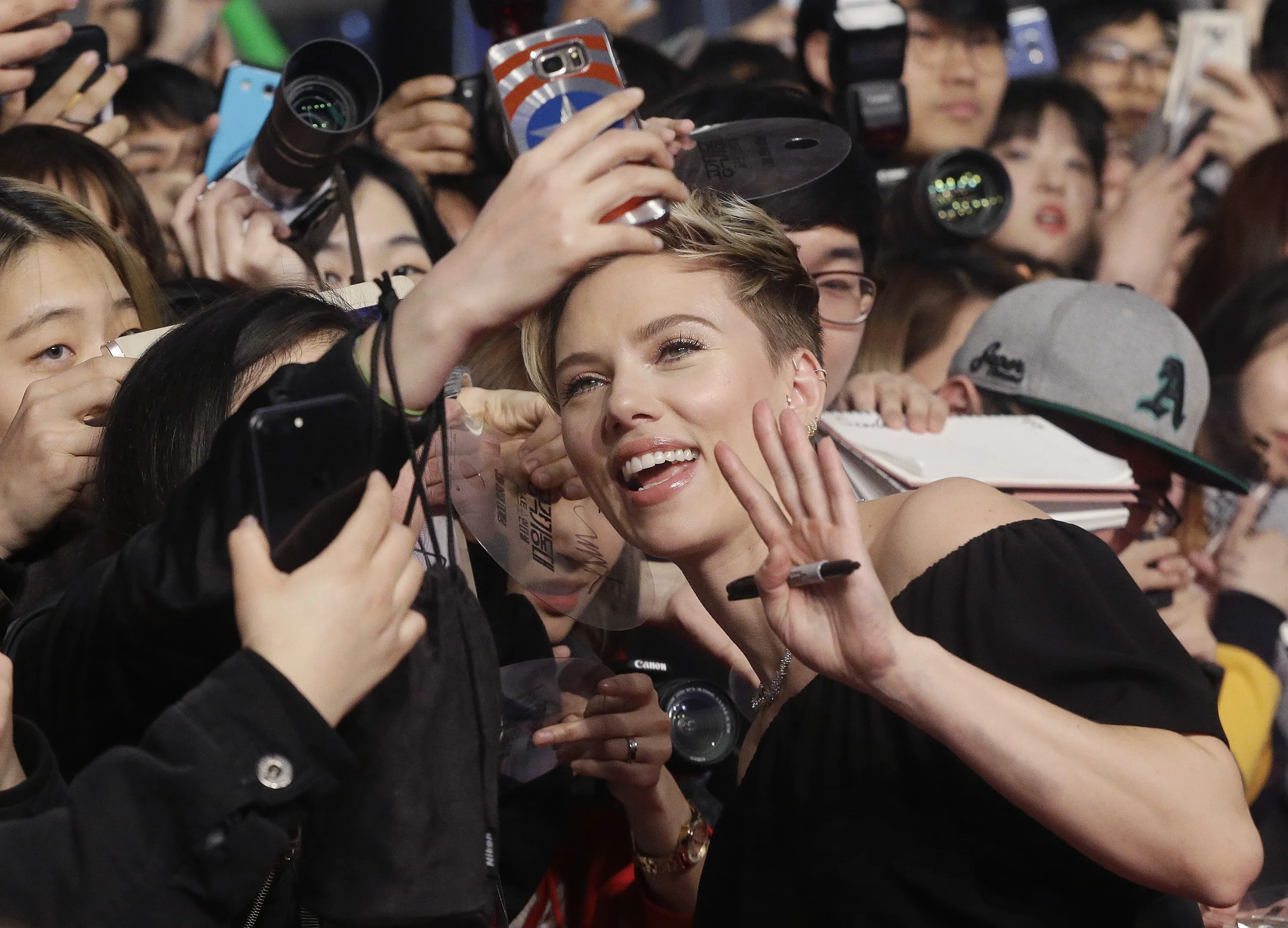 Actress Scarlett Johansson poses with fans for a selfie during a promotional event for her latest film “Ghost in the Shell” in Seoul, South Korea, Friday, March 17, 2017. The film will be released in South Korea on March 29. (Photo by Ahn Young-joon/AP Photo)
