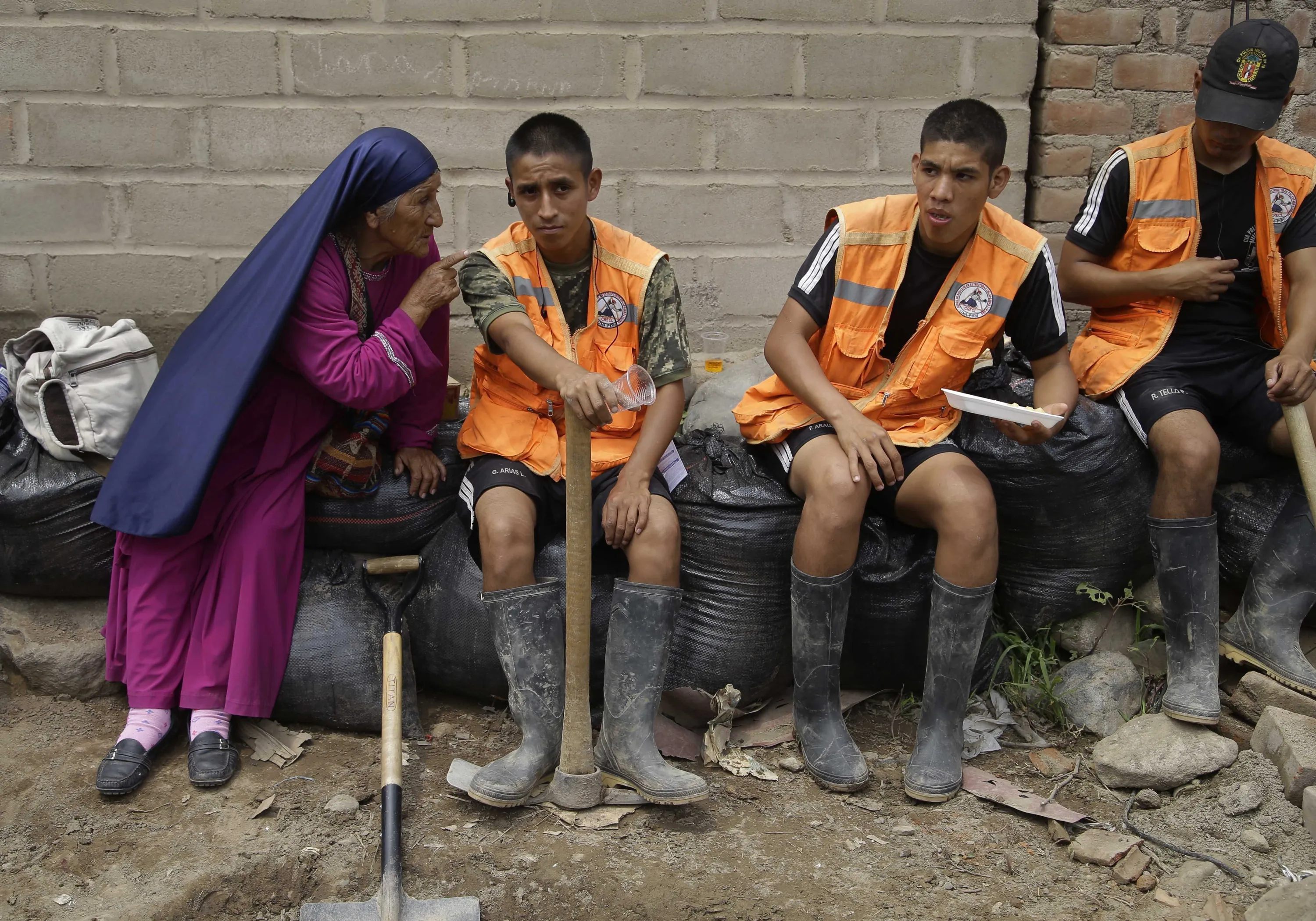 A woman from a religious sect, who lost her home to flooding, gives a religious lecture to soldiers taking a rest from cleaning a clogged river in the Chosica district of Lima, Peru, Sunday, March 19, 2017. (Photo by Martin Mejia/AP Photo)