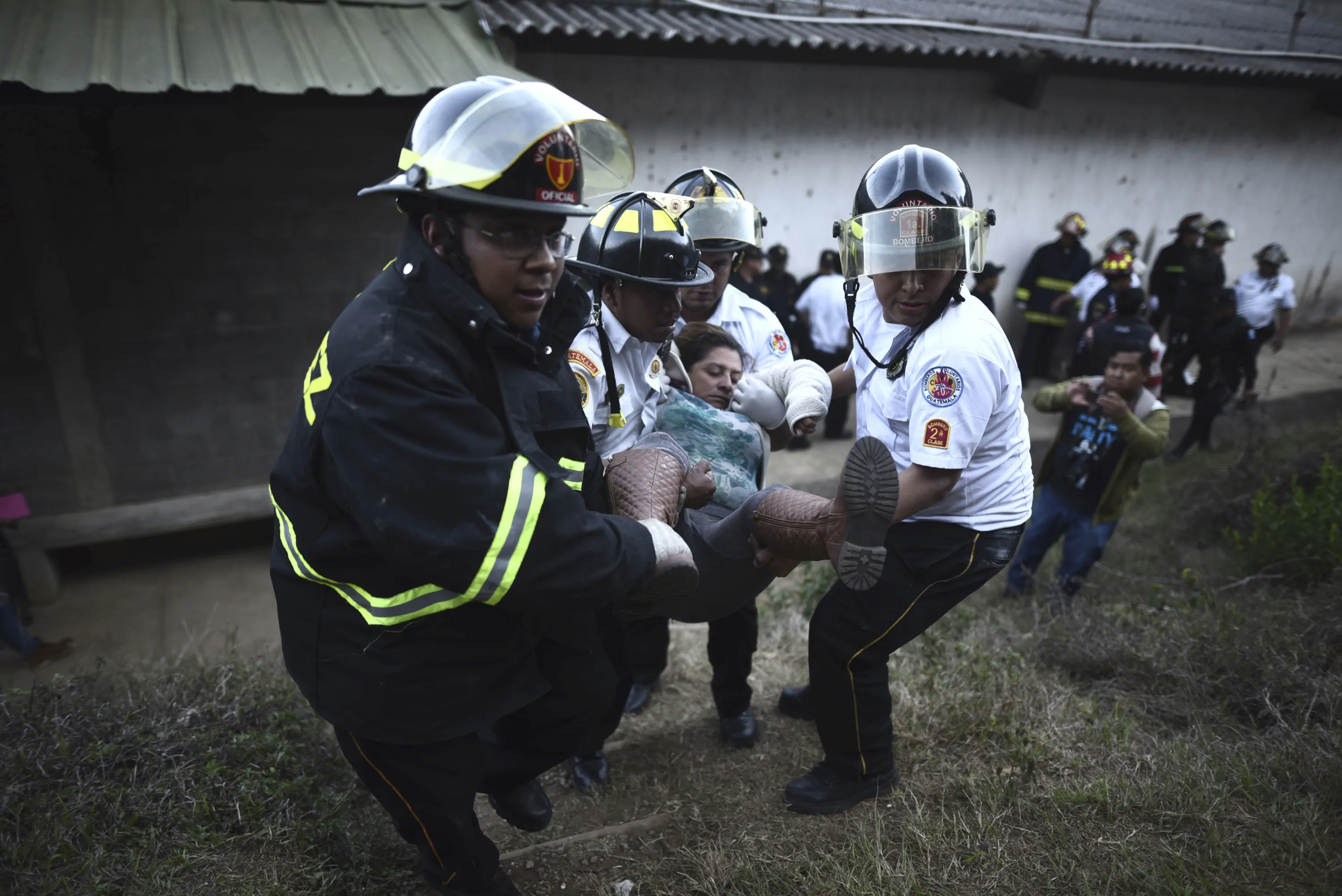 Firefighters carry a woman who fainted outside a reformatory for youth and men, Centro Correccional Etapa II, where a riot and fire broke out in San Jose Pinula, Guatemala, Sunday, March 19, 2017. At least one man died, a jail monitor, during the riot, according the police spokesman Pablo Castillo. (Photo by Oliver de Ros/AP Photo)