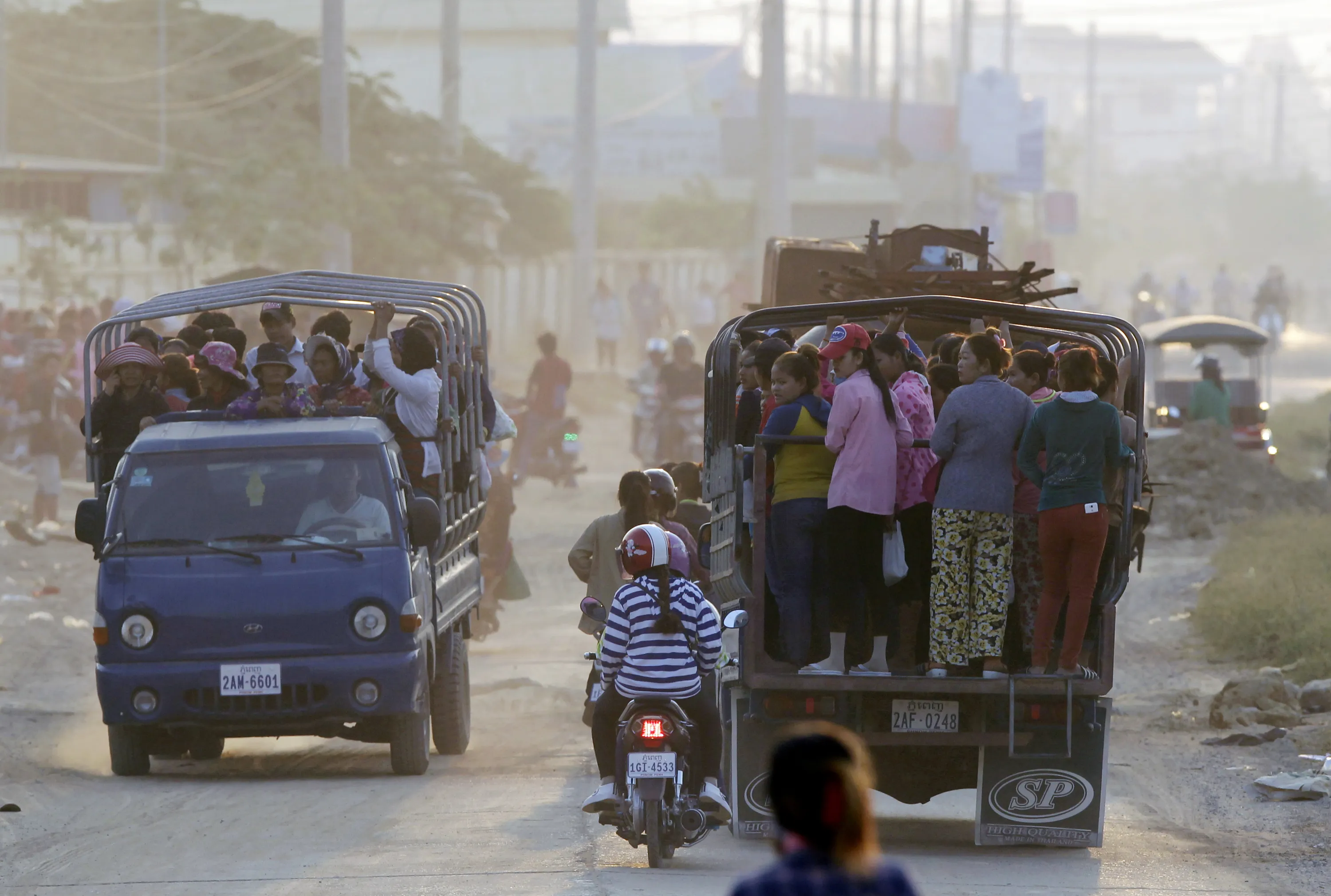 Workers ride trucks as daily transportation to work at factory near Trapang Anchanh village outside Phnom Penh, Cambodia, Wednesday, March. 15, 2017. (Photo by Heng Sinith/AP Photo)