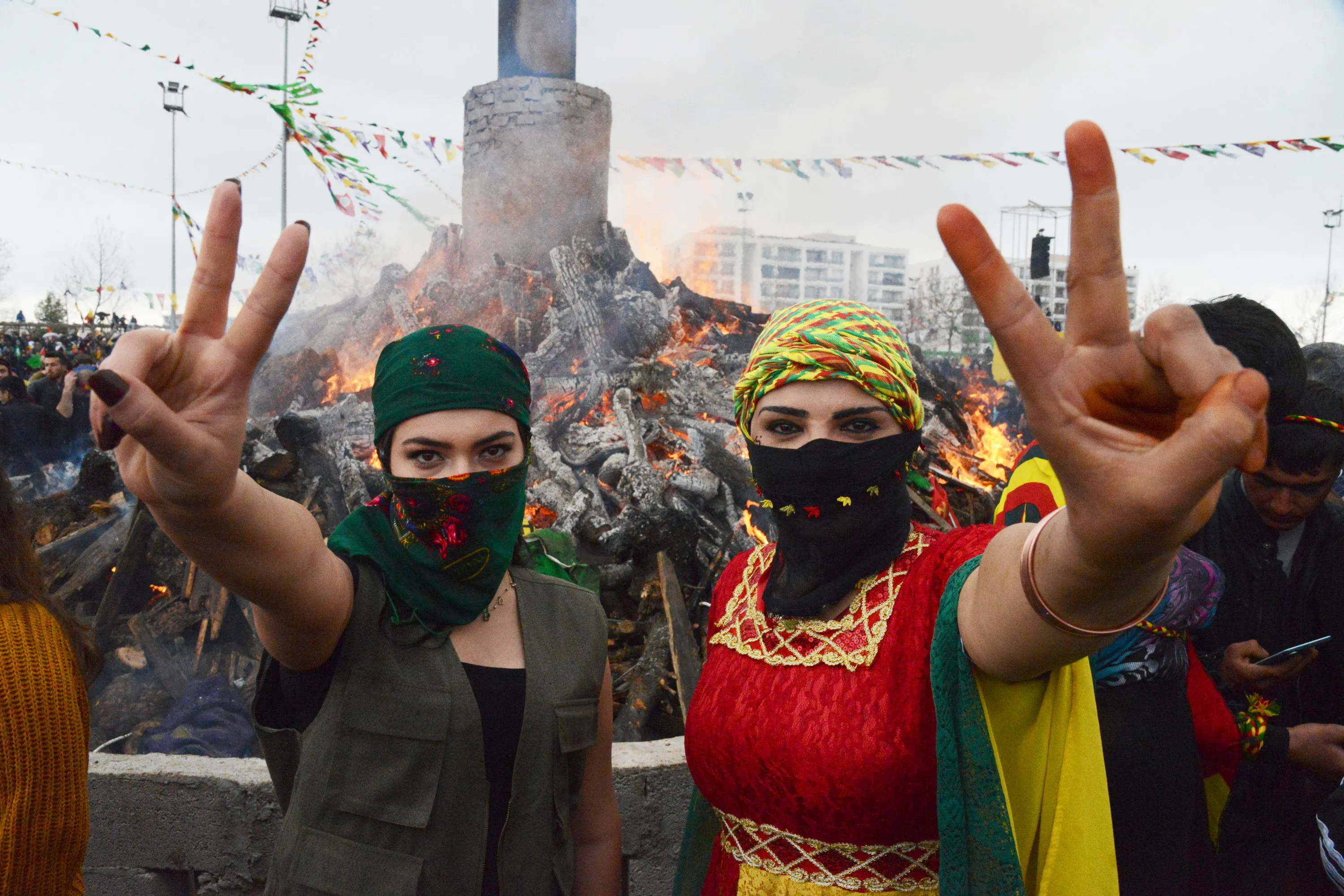 Young women flash the victory sign in front of a bonfire as Turkish Kurds gather during Newroz celebrations for the new year in Diyarbakir, southeastern Turkey, on March 21, 2017. Newroz (also known as Nawroz or Nowruz) is an ancient Persian festival, which is also celebrated by Kurdish people, marking the first day of spring, which falls on March 21. (Photo by Ilyas Akengin/AFP Photo)