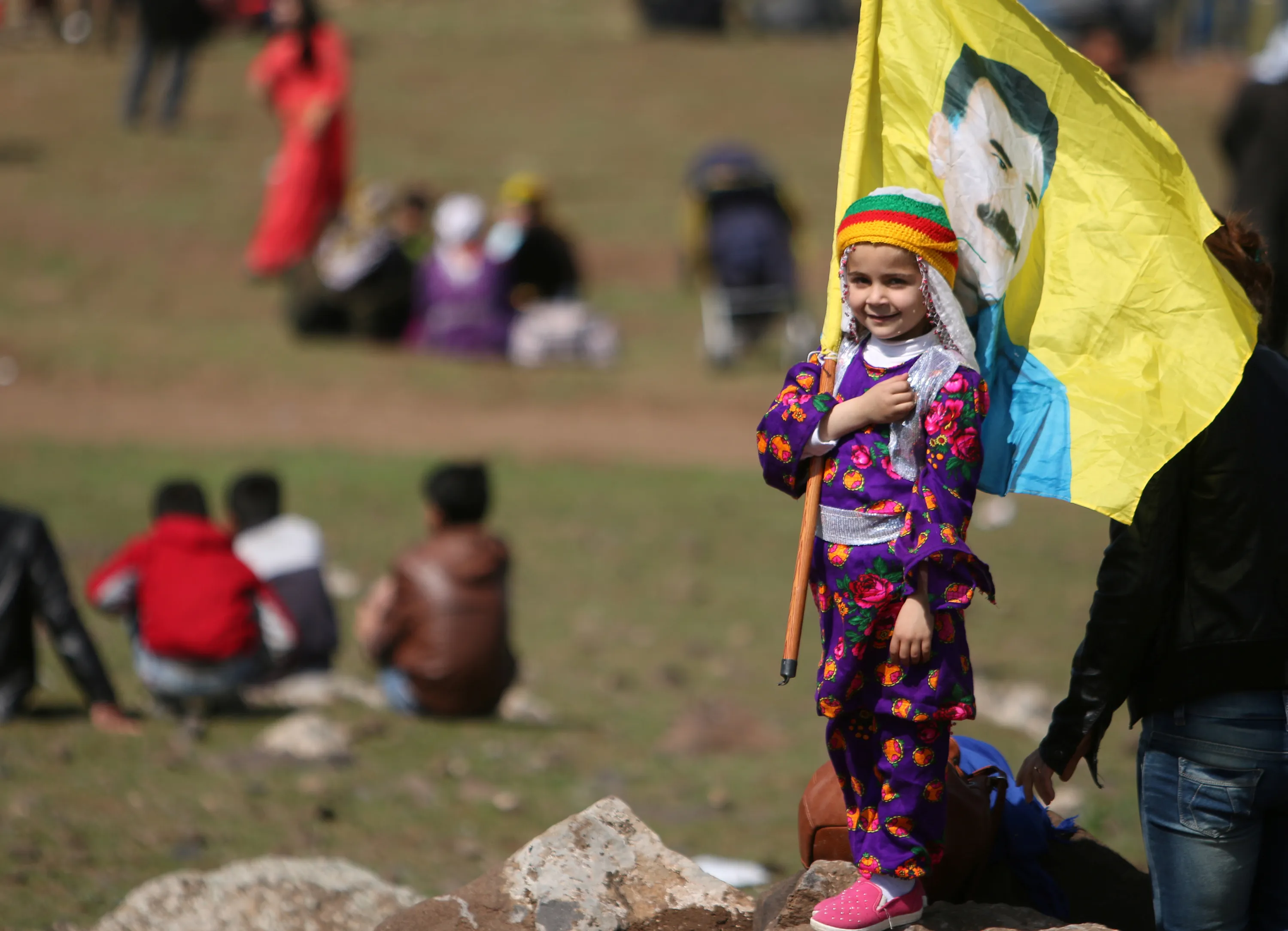 A girl carries a flag depicting jailed Kurdish leader Abdullah Ocalan of the Kurdistan Workers Party (PKK) during a celebration for the spring festival of Newroz, in al-Darbasiyah town, on the Syrian-Turkish border, Syria on March 21, 2017. (Photo by Rodi Said/Reuters)